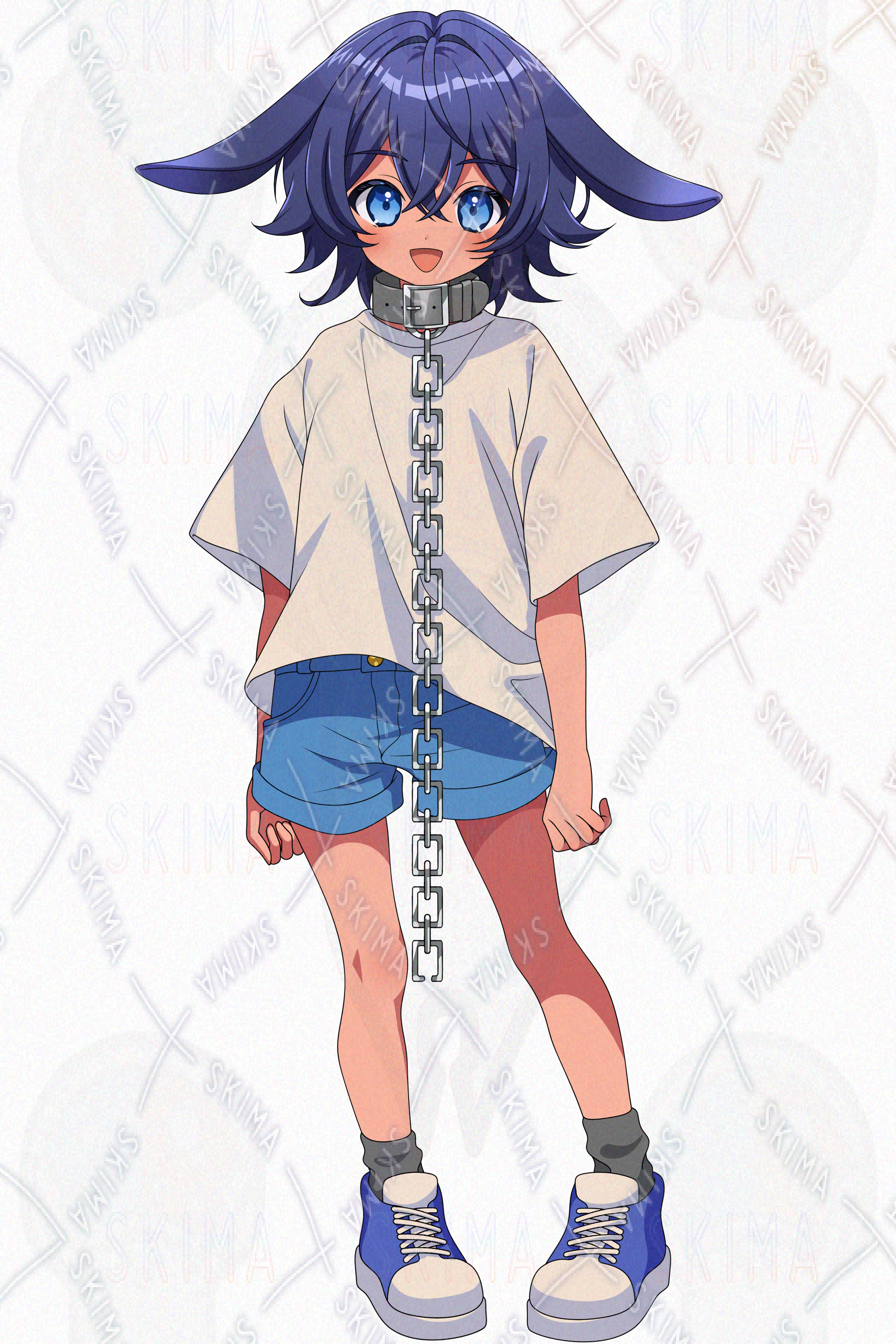 IRIAM対応、少年、ケモ耳、拘束具、鎖、シャツ、短パン、褐色肌、青髪