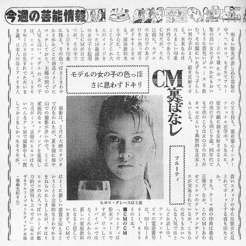 1979年夏、マスコミが一人の少女モデルに注目し始めた。その名はヒロコ・グレース。当時放送されていた飲料「フルーティ」(AGF)のCMが突如ヒットしたことが人気の発端だった。