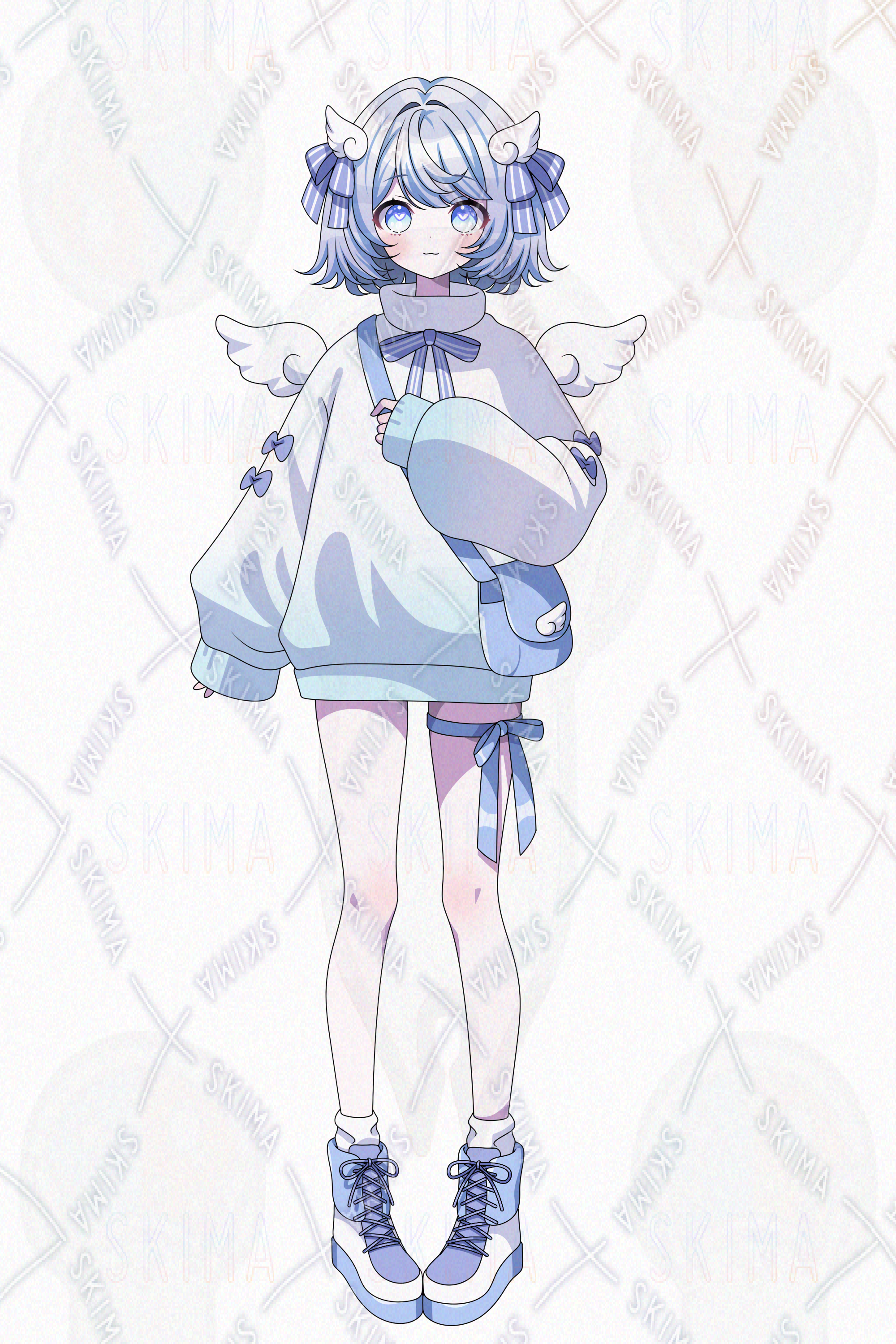 IRIAM対応、羽根、翼、ニットワンピース、ショルダーバッグ、リボン、スニーカー、ボブヘア、白、水色