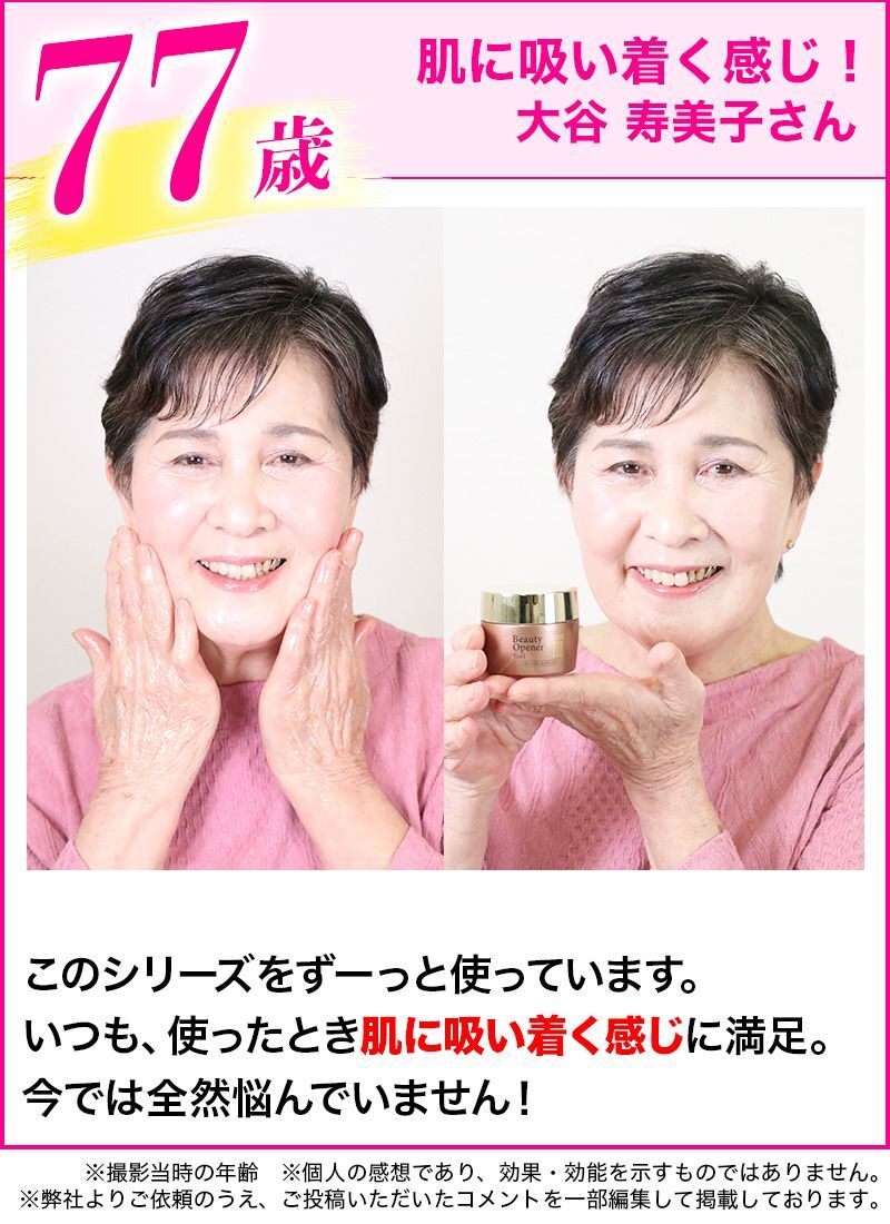※2:ビューティーオープナージェル リンクル&ホワイトの効能・効果のこと(ハリを与える、シワ改善、シミ・そばかす予防、肌あれ予防)