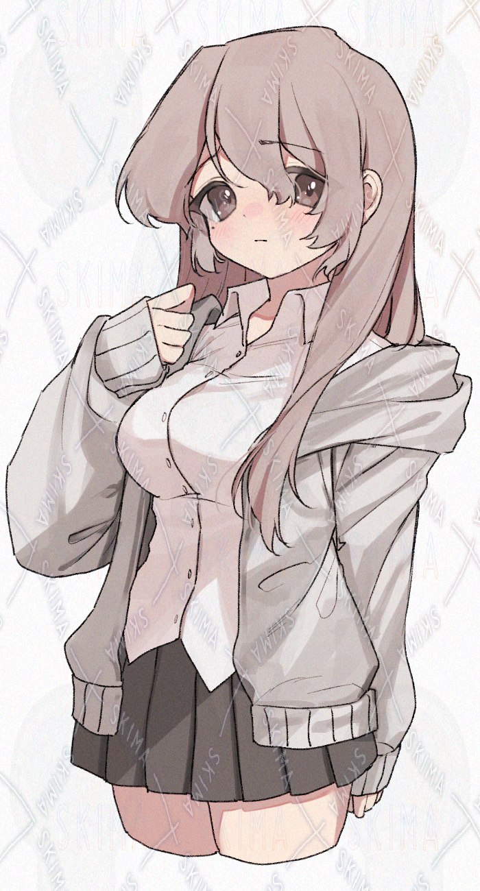 制服にパーカーを重ね着した女の子です。腿上。キャラ設定はご自由に。