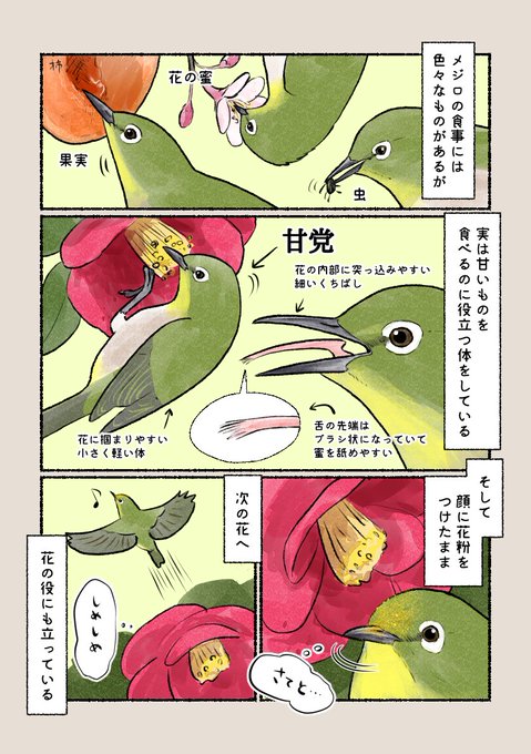 意外と知らない鳥の生活 「甘党の鳥、メジロ」 ツバキの花の蜜など、甘いものが大好きです。