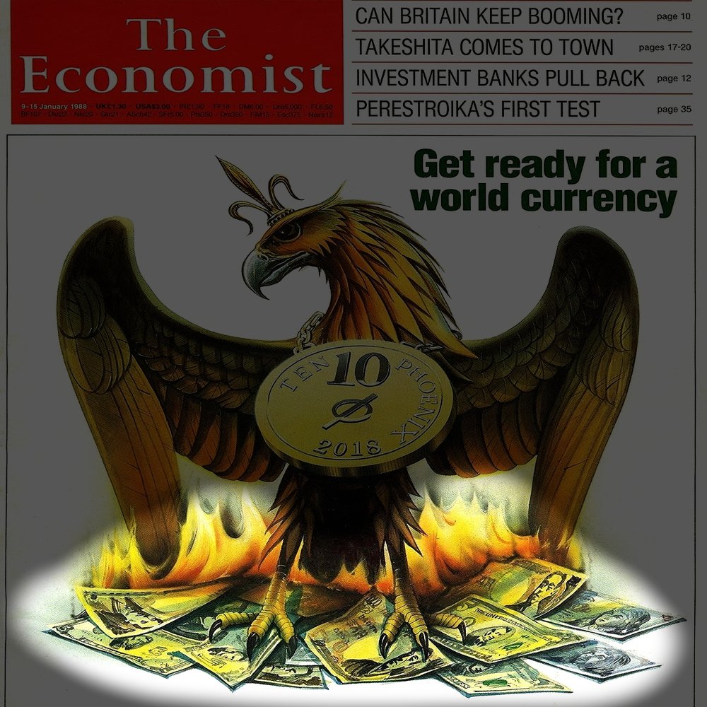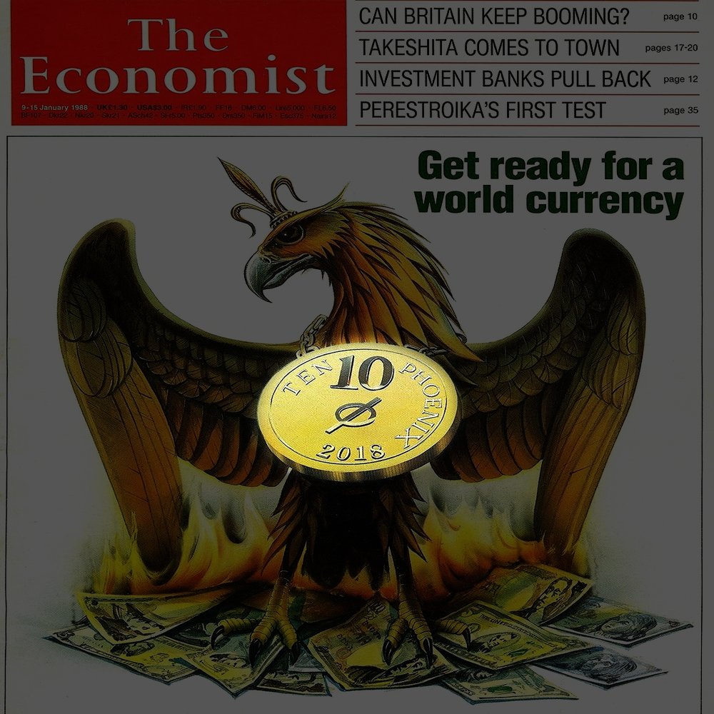 1988年に発行されたエコノミストの表紙。この表紙が示す時期は不死鳥の足元が示す通り。円・ドル・ユーロが激しく燃え、基軸通貨が終焉する時。つい数年前まで、そんなことを言ったらキチ○イ扱いでしたが、昨今の株価や世界の経済を見ていると、顕現化するのは時間の問題ですね。