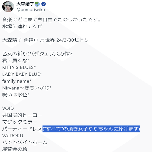 3/23のライブで私の名前呼んでくれて、「パーティードレス」歌ってくれたってきいた。