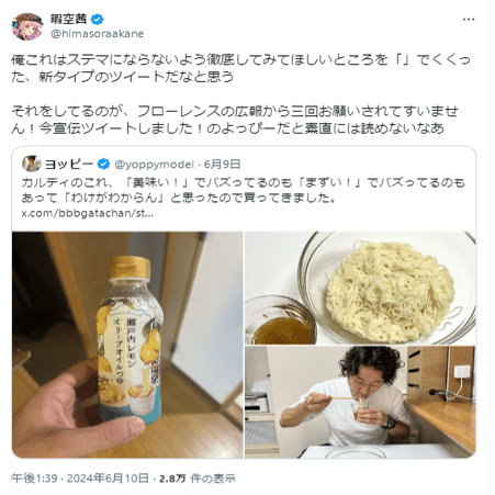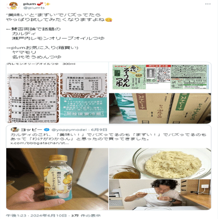 ひ「僕のこのツイートは「商品名、商品写真をかっちりうつし、「うまい」と「まずい」と両論併記を強調して紹介するっていう、なんというか「いじましい」ツイートだねっていう意見論評なんだけどね」