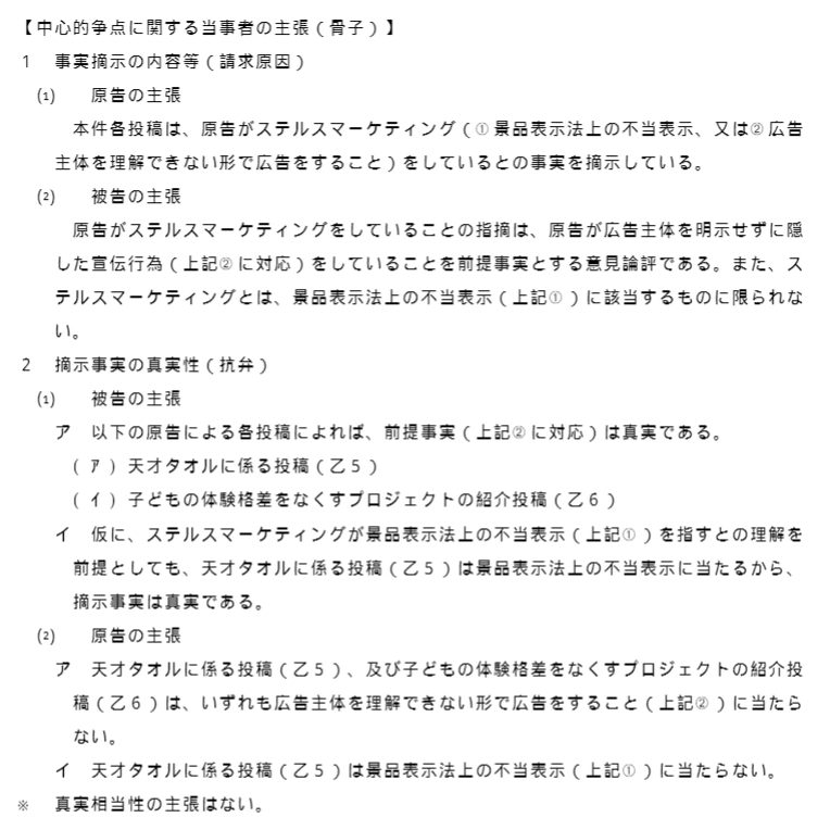 「被告が原告をステマライター等と言っている」というものであり、そのうえで「ステマ」の意義について景表法上違法なものという意味付けをされているものと認識しております。それゆえ、被告は天才タオルの例をあげて景表法上違法なステルスマーケティングであるとして真実性の抗弁を主張しているのであり、フローレンスの件については真実性の抗弁の根拠にしておりません。したがって、裁判所の整理で正しいと考えております。」
