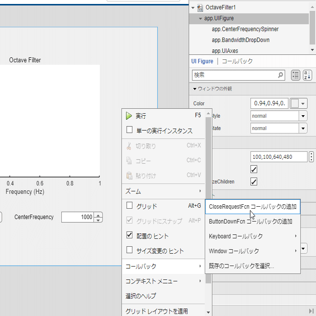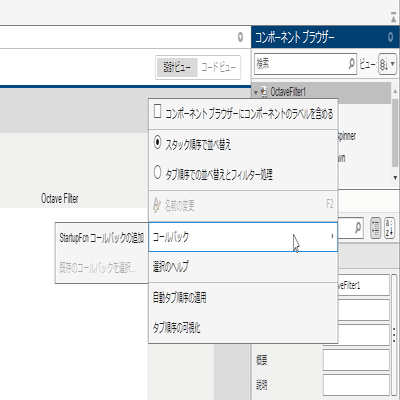 右ペイン[コンポーネント ブラウザー] の階層最上位のアプリノード(OctaveFilter1)を右クリックし、[コールバック] 、 [StartupFcn コールバックの追加] で追加します。