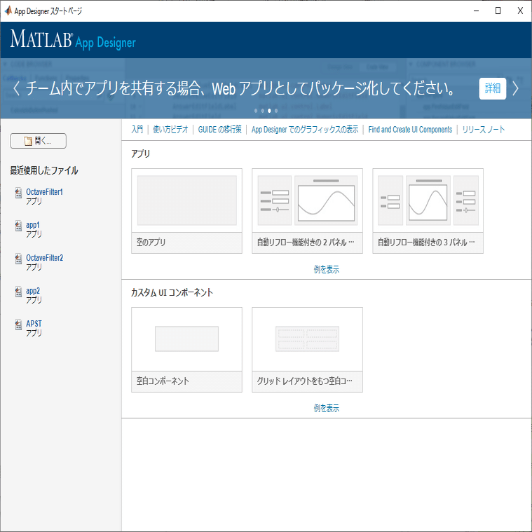 > appdesignerで起動し、目的に近いテンプレート、もしくは空のテンプレートから作ることができます。ここで短い対話式チュートリアルを見ることもできます。