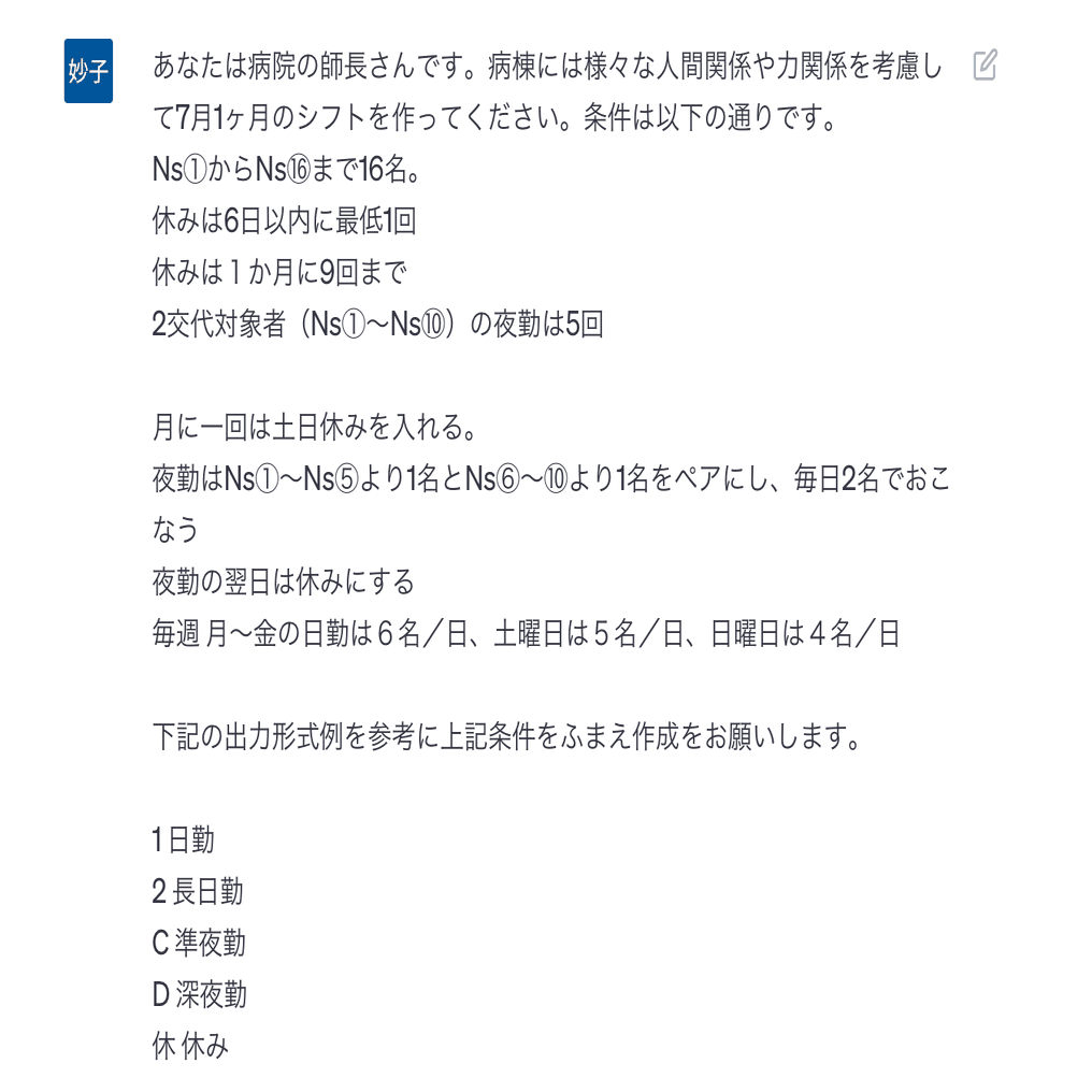 ChatGPTを使って看護師の勤務表を作ってみた
