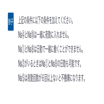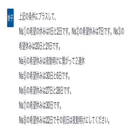 しかし、病棟には複雑な人間関係があります。AさんとDさんの夜勤は絶対にダメとか……。下記のような条件を加えてもらいました。夜勤多めのリクエストも追加しました。