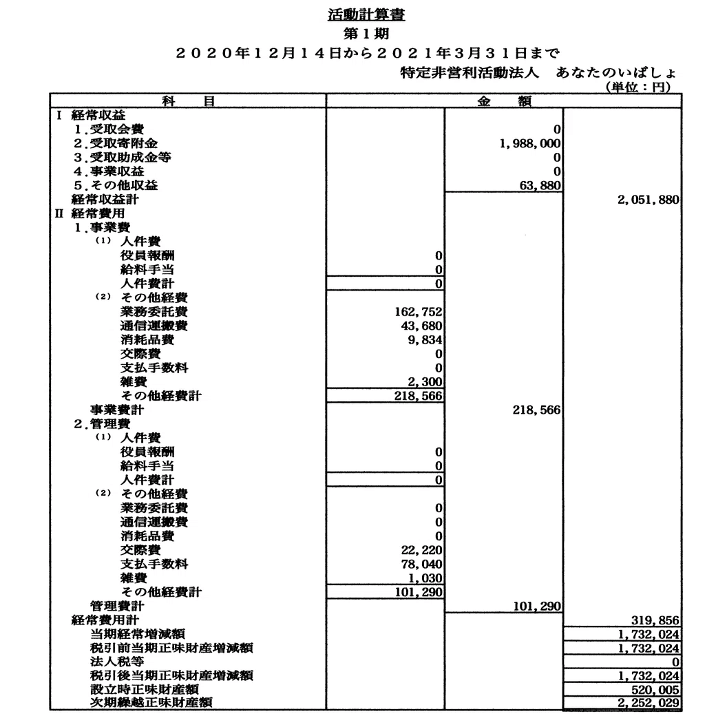 下掲の活動計算書を見れば、実際に業務委託費でソフトウェア開発費用が支出されていることもわかります。(上掲の補助金精算資料に記載されているシステム投資のための支出額とほぼ一致)