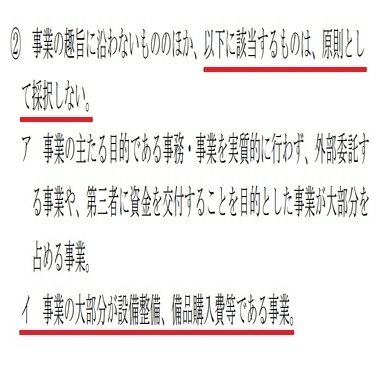 資金使途の問題とは別に『原則として』「事業の大部分が設備整備、備品購入費等である事業」は採択しないとの公募要綱の記載も気にかかります。