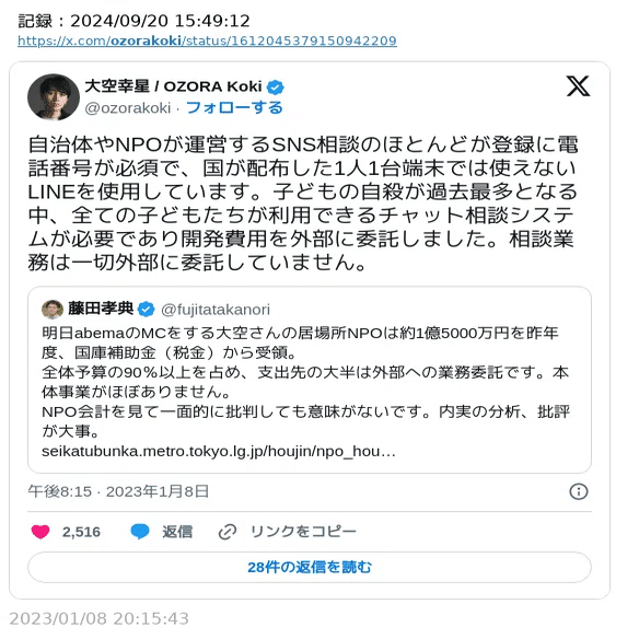また、当時大学生の大空氏が代表者だったあなたのいばしょさんは、代表者に経験無ェ、団体に実績無ェ、そもそも事業に使うツールも無ェという、吉幾三さんの「俺ら東京さ行ぐだ」状態だった様子で、厚労省に提出した事業計画は、「145百万円の補助金が欲しいけど、その内の90百万円は直接事業費じゃなくて、事業基盤を整えるためのチャットツール投資に充てさせてね」という、ゆるふわでメルヘンチックな内容であったことも見過ごせません。せめて事業を遂行できるようになってから申請しましょうや。