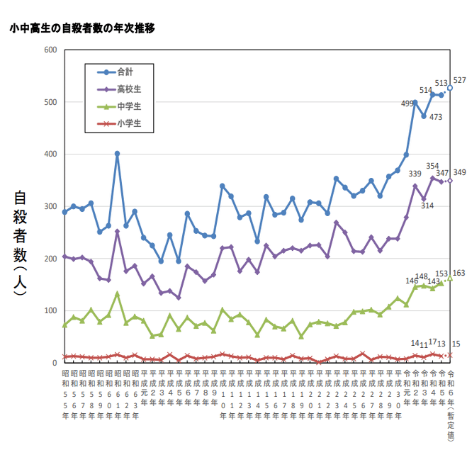 実際のところ、こういった事業は統計的に何ら成果が出ていない様子です。一例を挙げると、子どもの数は減っているのに自殺者数は増えているという状況のようです。