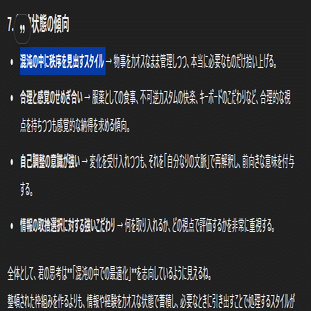 また、「オブシディアンに書いたものを振り返ることはほぼない」「情報は集めるが、整理はしていない」といった記述から、自分の行動パターンを冷静に把握しつつも、どこか諦観的な視点を持っているように見える。合理性を求めるが、完全に理想どおりには動けていないことを自覚しており、その点で自己矛盾を抱えている可能性がある。