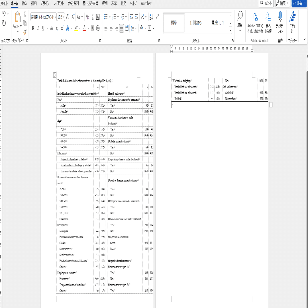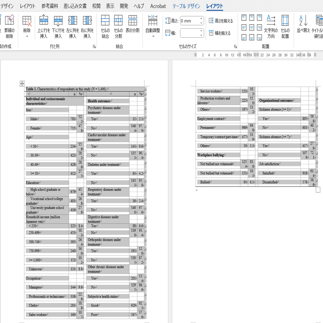 Wordに張り付け。すると、レイアウトが崩れます。横幅が収まっていないですし、ページも2枚にまたがってしまっています。