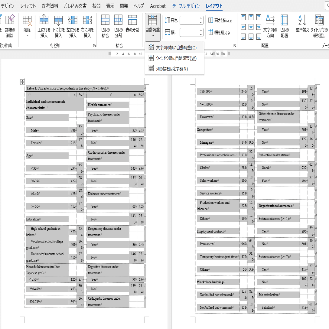 ここからが本番です。まず、表全体を選択します。そうすると表ツール「テーブルデザイン」「レイアウト」が表示されるので、「レイアウト」→「自動調整」→「文字列の幅にあわせる」を選択します。これで、少なくとも横幅は収まるようになりました。