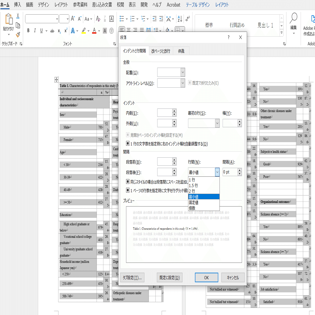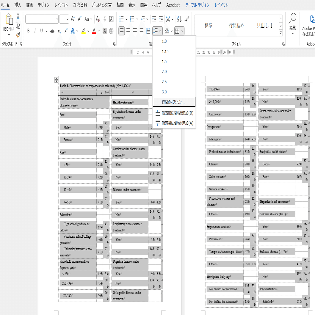 ここから、縦を短くしていきます。また表全体を選択し、「ホーム」タブの「段落」の中から「行間オプション」を選択し、