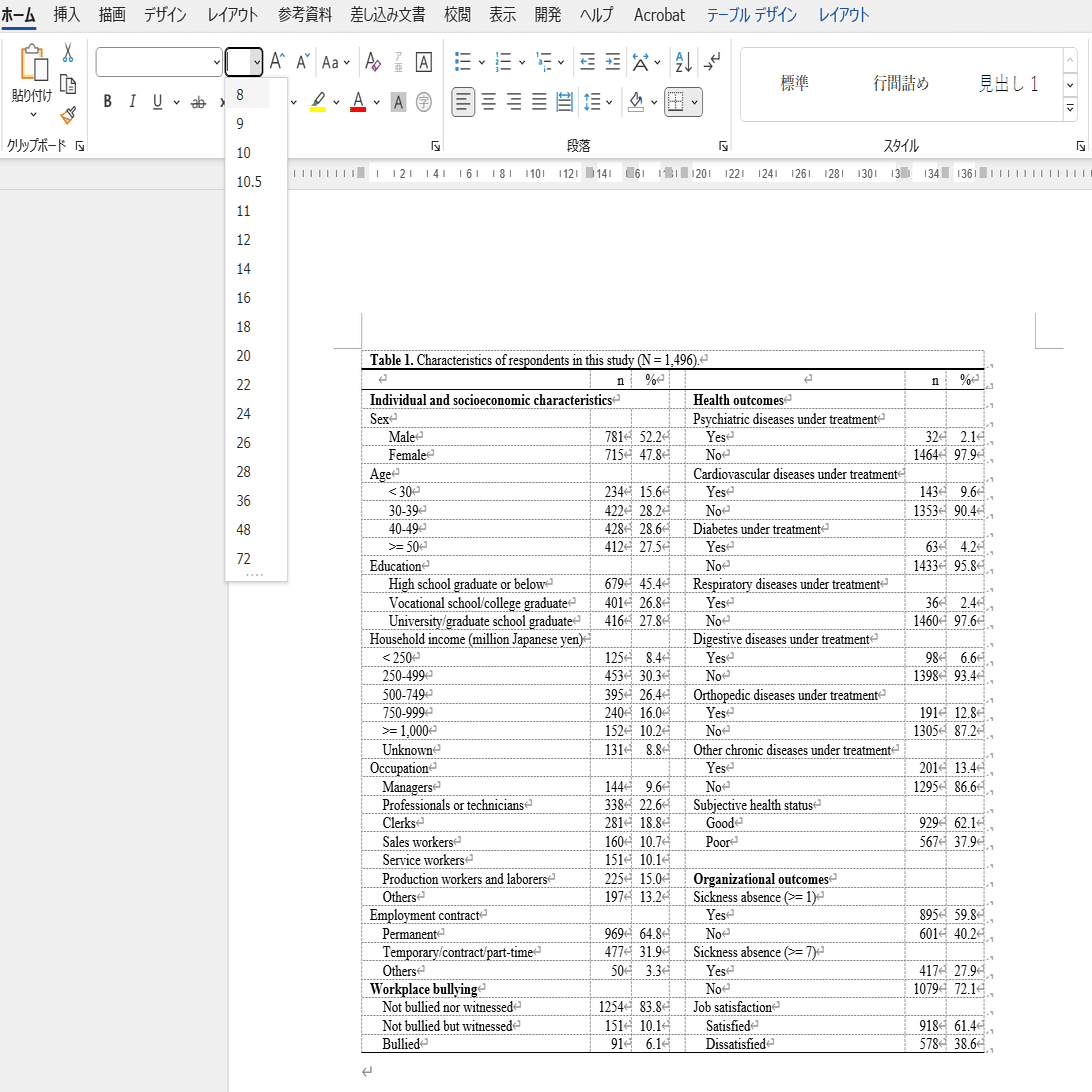 まだ収まりが悪い場合は、「ホーム」で表のフォントサイズを小さくします。これでほとんどの表が、Word 1枚に収まるようになります。今回は「8pt」できれいに収まりました。