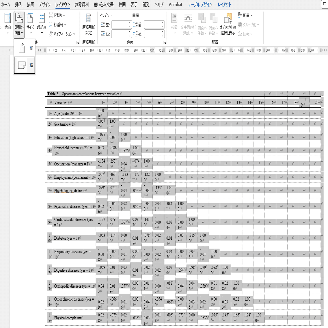 これでも横幅が収まらない場合は、最終手段です。Wordの「レイアウト」の「印刷の向き」を横向きにします。他の表も横向きになってしまわないように、予め「レイアウト」→「区切り」で表が貼られたページの前後をセクション区切りしておきます。