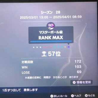 この構築で選出率が高かったのは数えてないけど間違いなくディンルーカイリュー。オーガはあんま出せなかった。禁伝出さないと純粋にパワーが落ちるのでランクマで安定しづらいなーと思いました。上位で結果残してても「すごっ!」とはならないけど「頑張ったんだろうなー」と思うぐらいの強さでした。前作が強すぎたね。