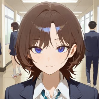brown eyes, looking at viewer, smile: 表情。ここが入れ替え対象に入っているのは後ろ向きの際に削除したいから
