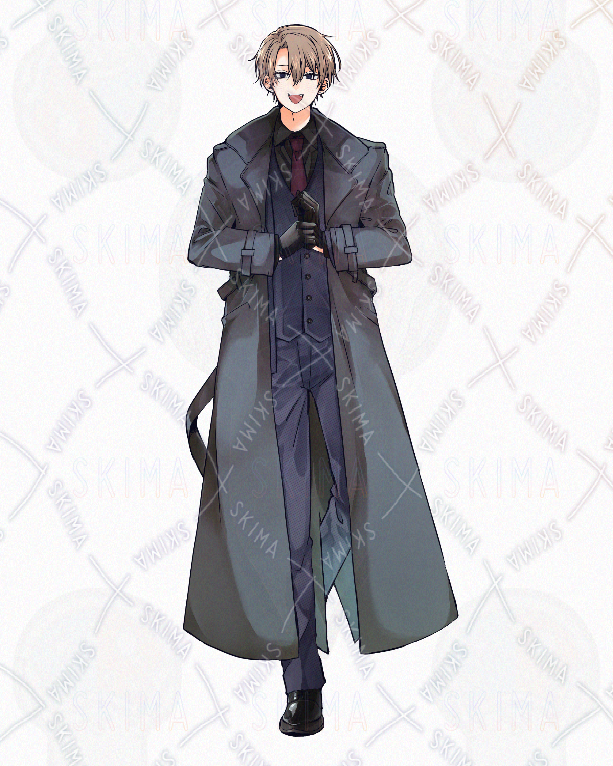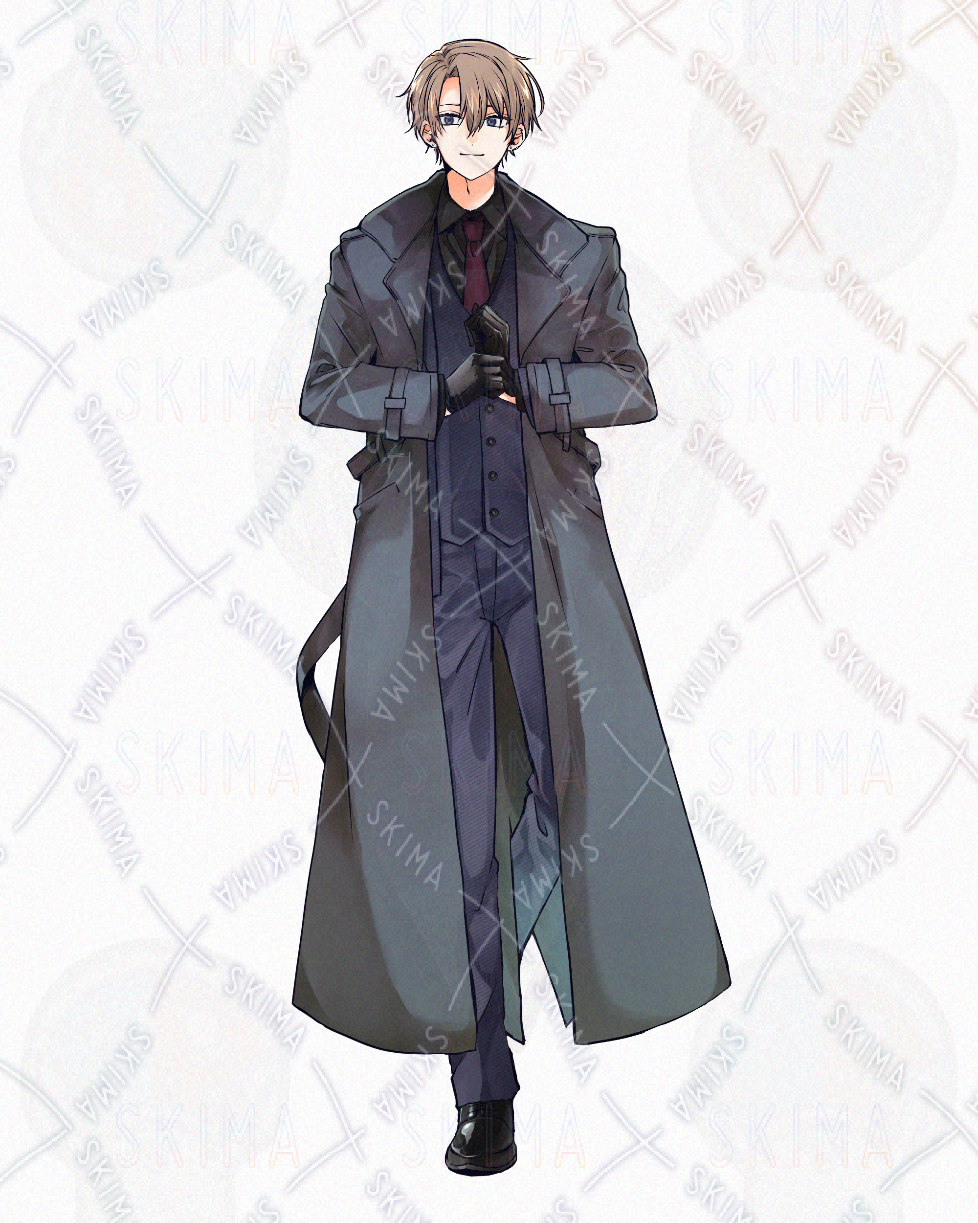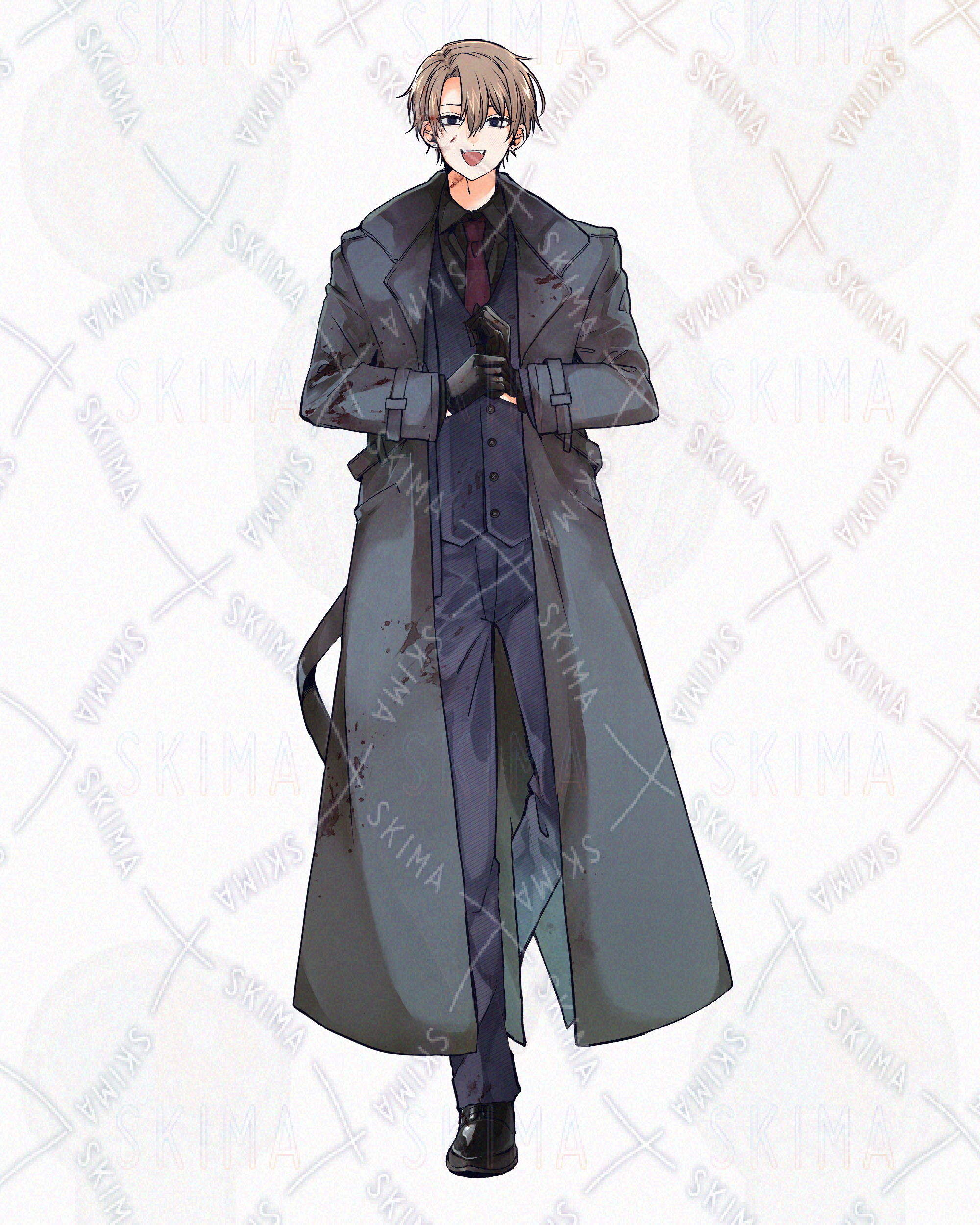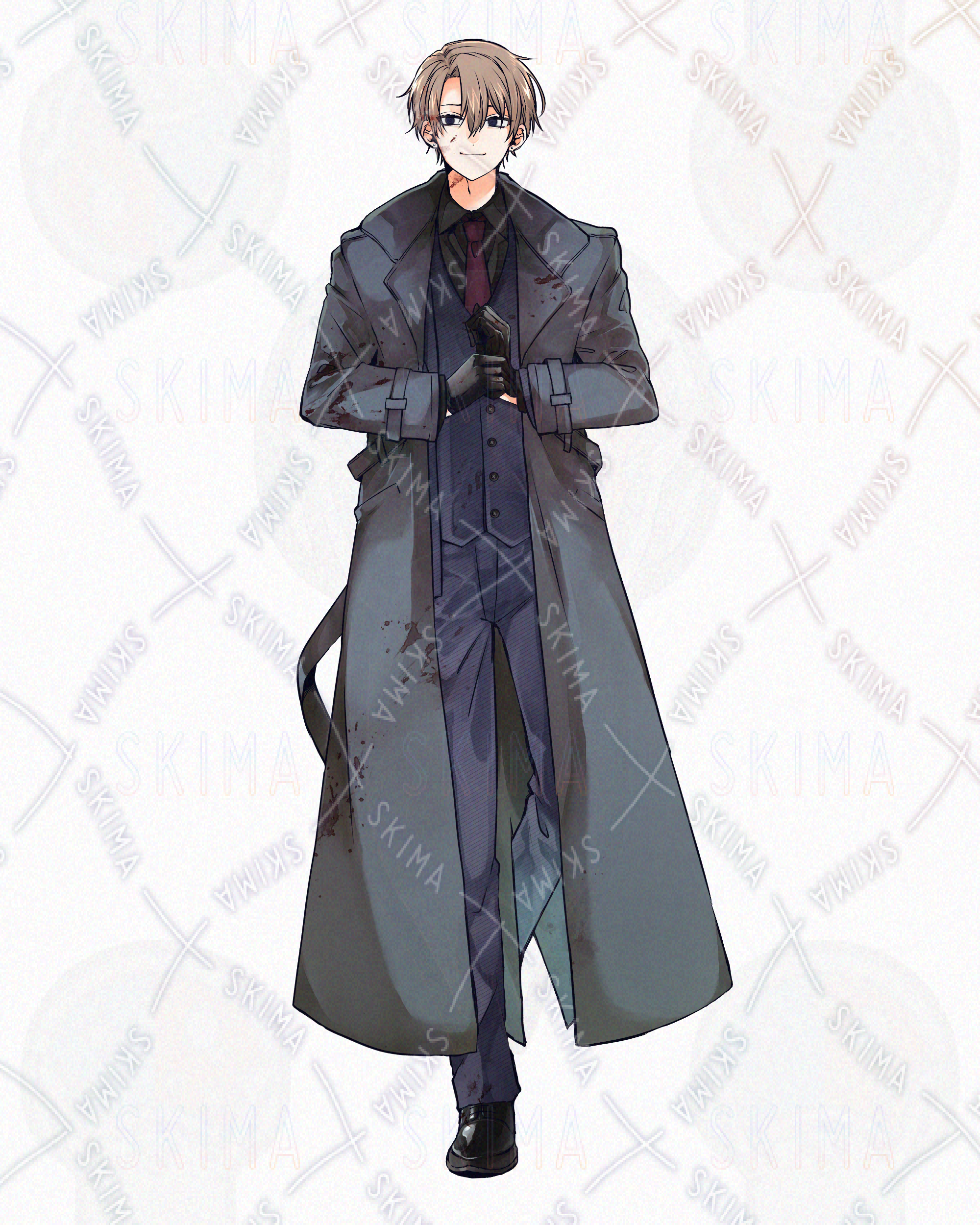 全身立ち絵 男性 茶髪 ダウナー クール 殺人鬼 スーツ コート 悪役 サイコパス 黒手袋