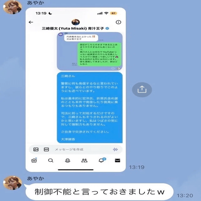 そのことを知った三崎氏は、大津氏に対し「大津氏の権限で街宣を止めてほしい」という旨のDMを送りますが、大津氏は「私はつばさの党に対して強制力もありません」として、黒川容疑者の街宣を止めることをしませんでした。最終的には大津氏から「これ以上話すことはありません」と会話を強制終了されてしまい、予定通り黒川容疑者らによる青汁ヒルズ前街宣が決行されてしまいます。