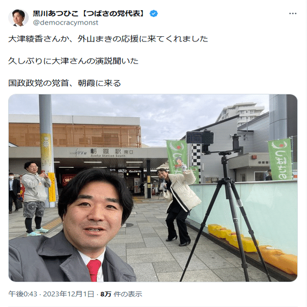前述のいざこざもあり、大津氏とつばさの党との関係は修復不可能かと思われましたが、2023年12月に朝霞市議会議員選挙が行われた際、大津氏は黒川容疑者の内縁の妻でもある外山まき・朝霞市議会議員の応援に来ており、黒川容疑者とも楽しげに写真撮影をしています。