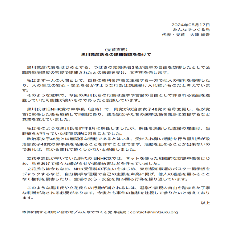 黒川容疑者らが逮捕されたという報道を受け、直近の上司でもあった『みんなでつくる党』(略称:みんつく党)代表・大津綾香氏(31)は以下の声明文を発表しました。