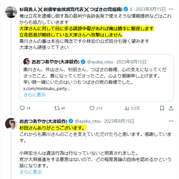 杉田容疑者に至っては、黒川容疑者の解任直後から「大津さんに対して目に余る誹謗中傷があれば俺は勝手に駆逐します」「大津さんへ攻撃はしません」として、今後も大津氏を守っていくことを宣言し、大津氏もこれに感謝の意を示しています。
