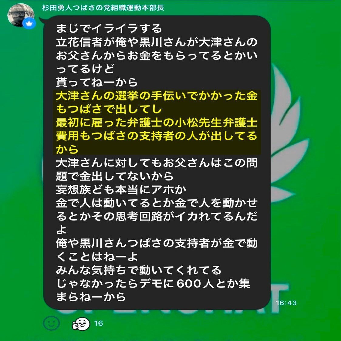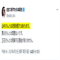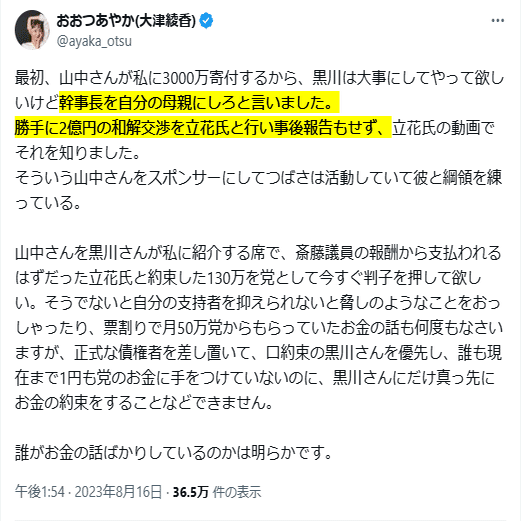 (※1)粟飯原美佳氏:NHK党・政治家女子48党時代の役員(監事・会計担当者)。大津氏が職員の給与を保証しなかったことにより対立。2023年6月28日に大津氏から解任を発表される。大津氏からは「金庫番の女性」と揶揄されている。