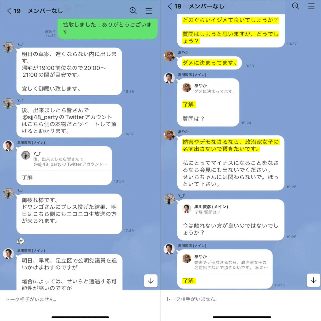 4月下旬頃には党幹部限定のLINEグループチャットを作成し、以下のメンバーで連絡を取り合うようになりました。