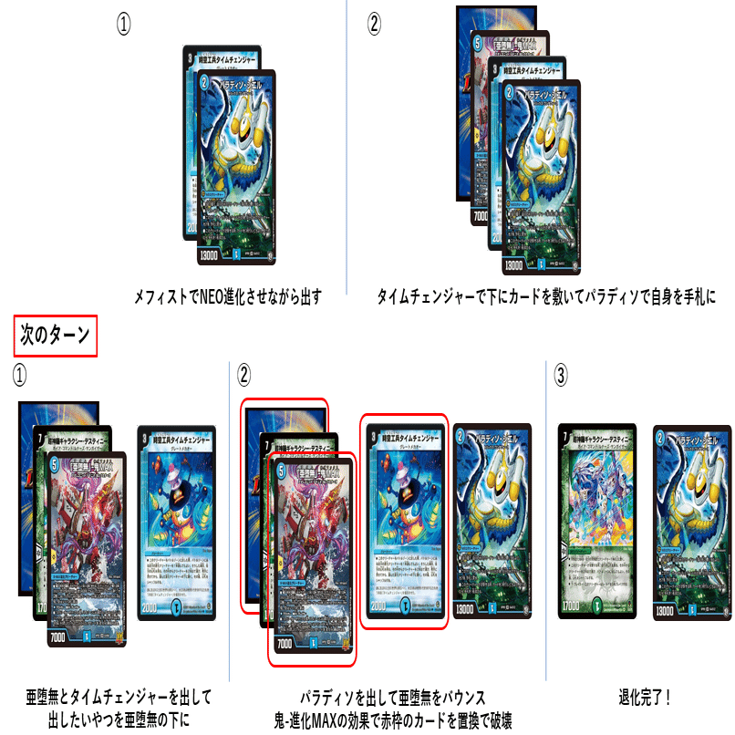 タイムチェンジャーからパラディソにNEO進化。タイムチェンジャーの効果でNEO進化させてるパラディソの下に亜堕無と好きなカードを敷きます。その後、パラディソの効果で自身をバウンス。次ターンに亜堕無を出した後、タイムチェンジャーで亜堕無の進化元に退化させるカードを敷き、パラディソを召喚。パラディソの効果で亜堕無をバウンスする時に鬼-SMAXの効果で亜堕無を含む3枚のカードを破壊することで退化させます。こちらも退化先はギャラクシーデスティニーやカリビアンムーンです。