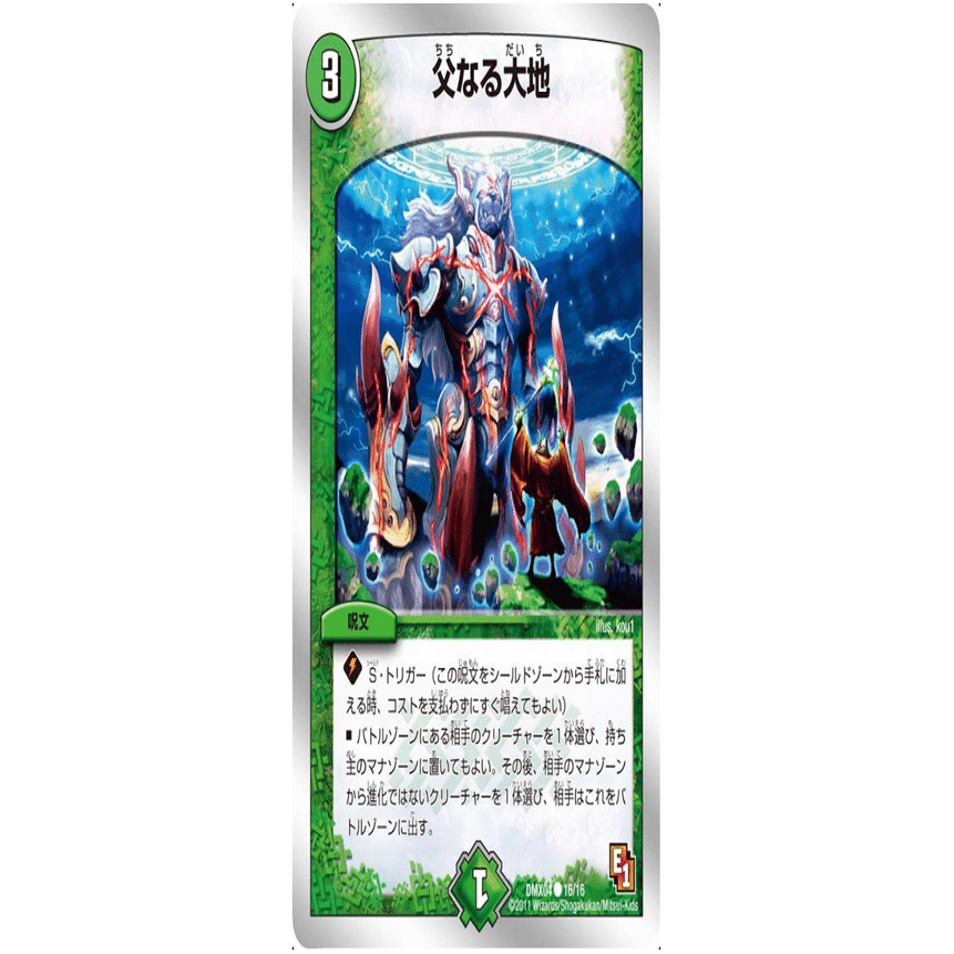交渉をすることで攻めにも守りにも使える器用なカードです。交渉無しでも3コストで厄介なクリーチャーを退かせるため強力です。父なる大地を使うのはこのデッキが初めてでしたが、卓内に高いレベルのデッキが居る時に特に輝くカードだと感じました。