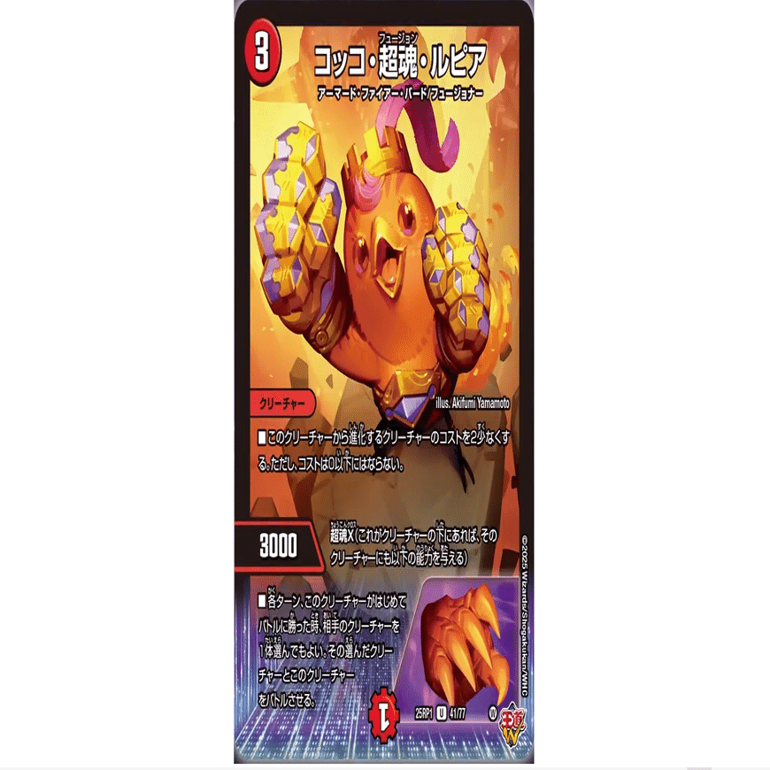 タイムチェンジャーや強制バトルのカードと相性が良いです。また、進化ジャイアントであるため超重竜ゴルファンタジスタ等のカードで触りやすく、即時打点として活躍してくれます。