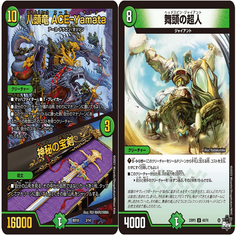 これら2枚を同時に出して、舞頭の超人の効果でACE-Yamataに2回バトルさせることでマナからの踏み倒しを2回狙えます。このデッキで一番盤面を展開できるコンボです。