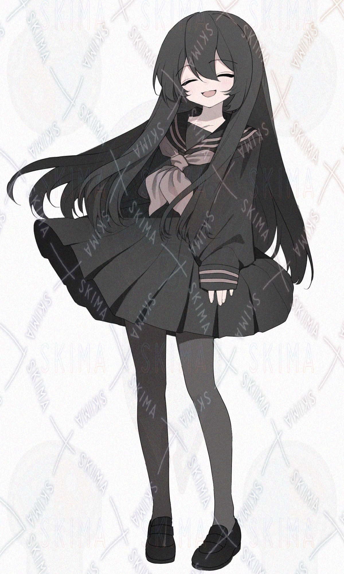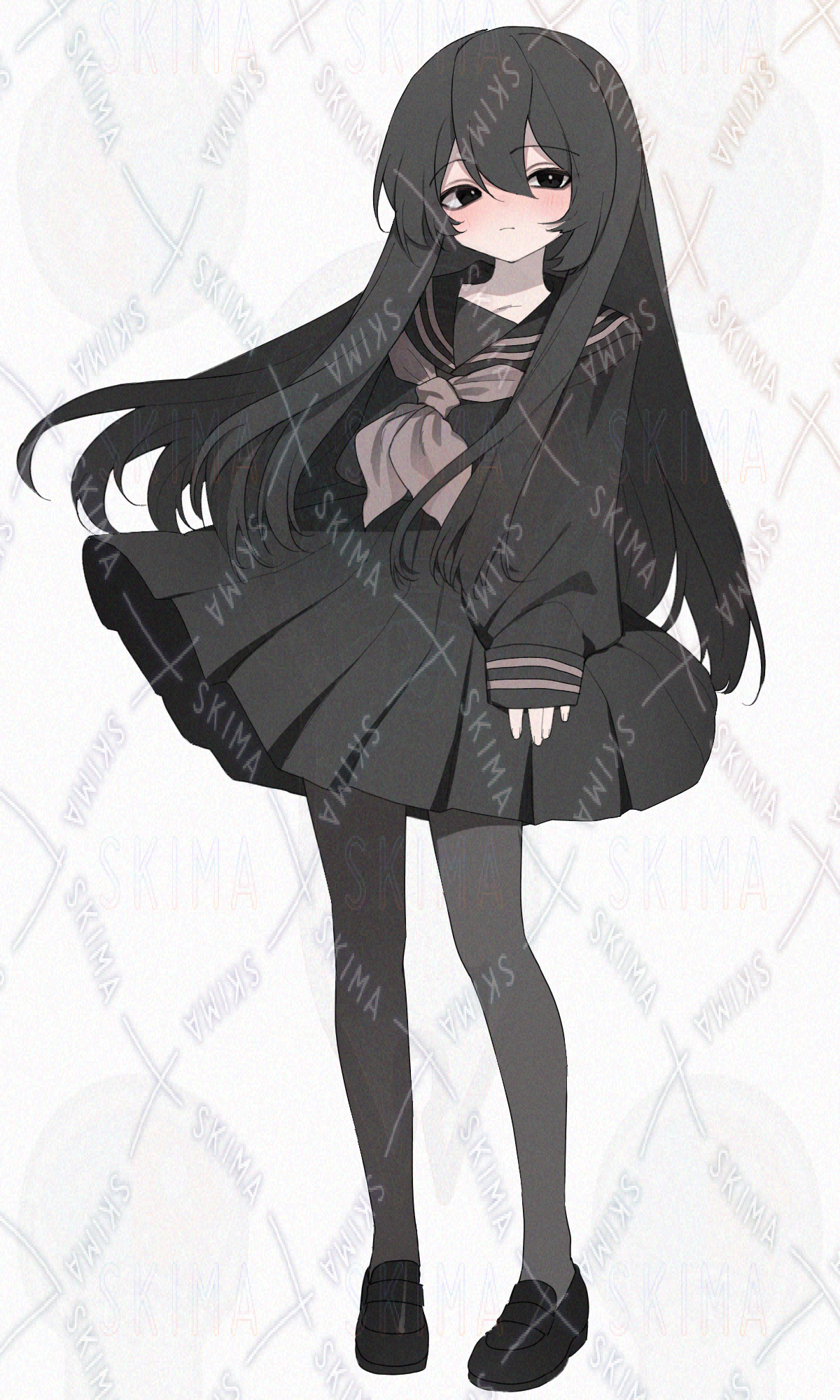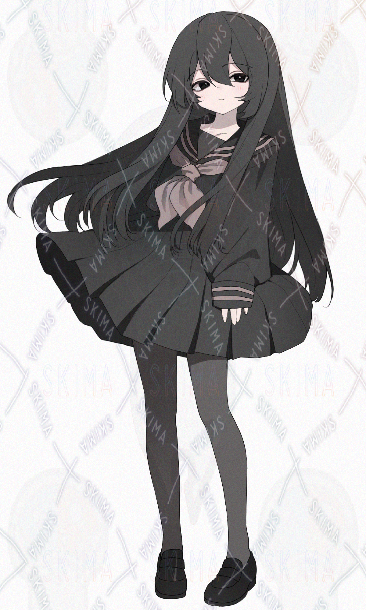 黒髪ロングヘア、黒いセーラー服、黒タイツの女の子です。キャラ設定はご自由に。