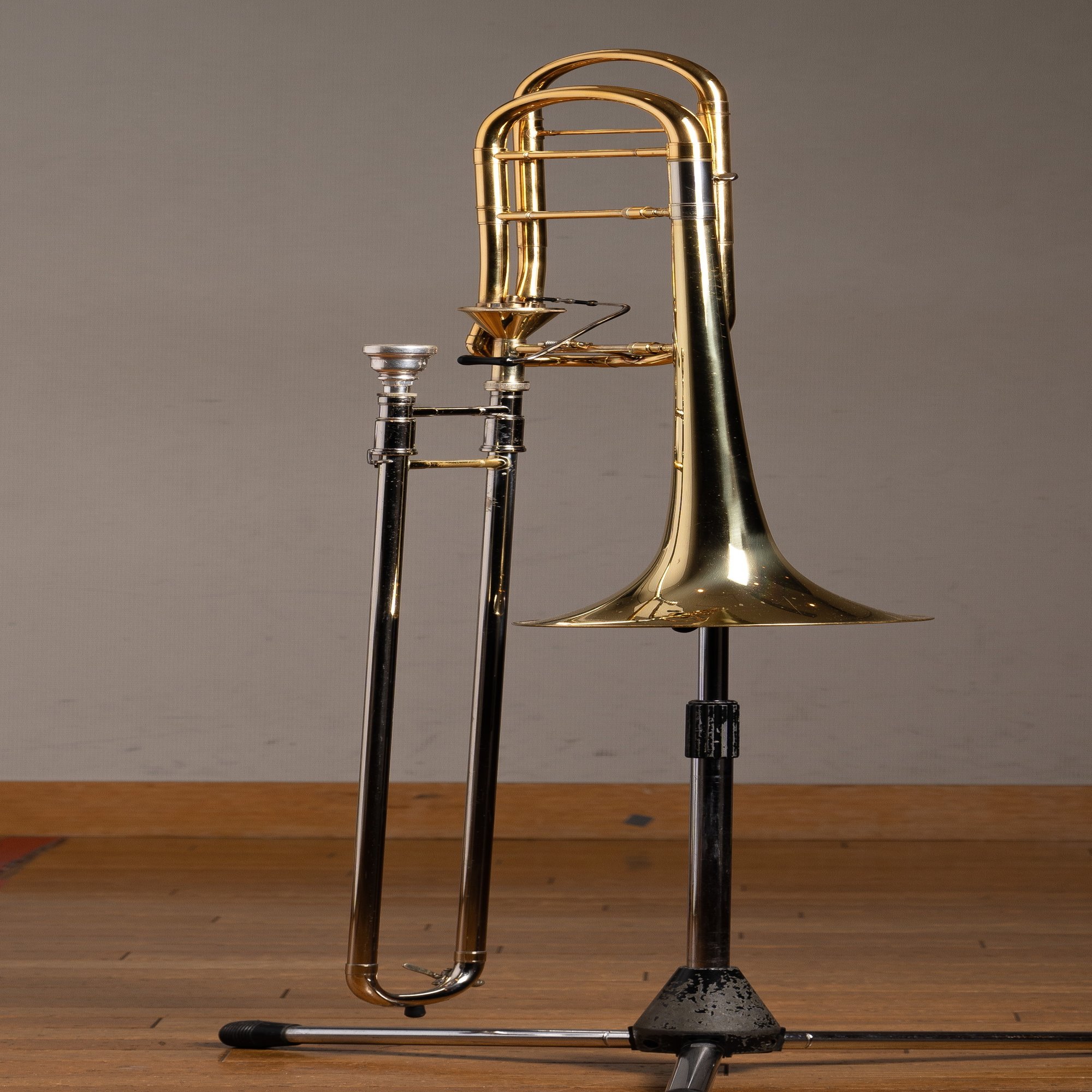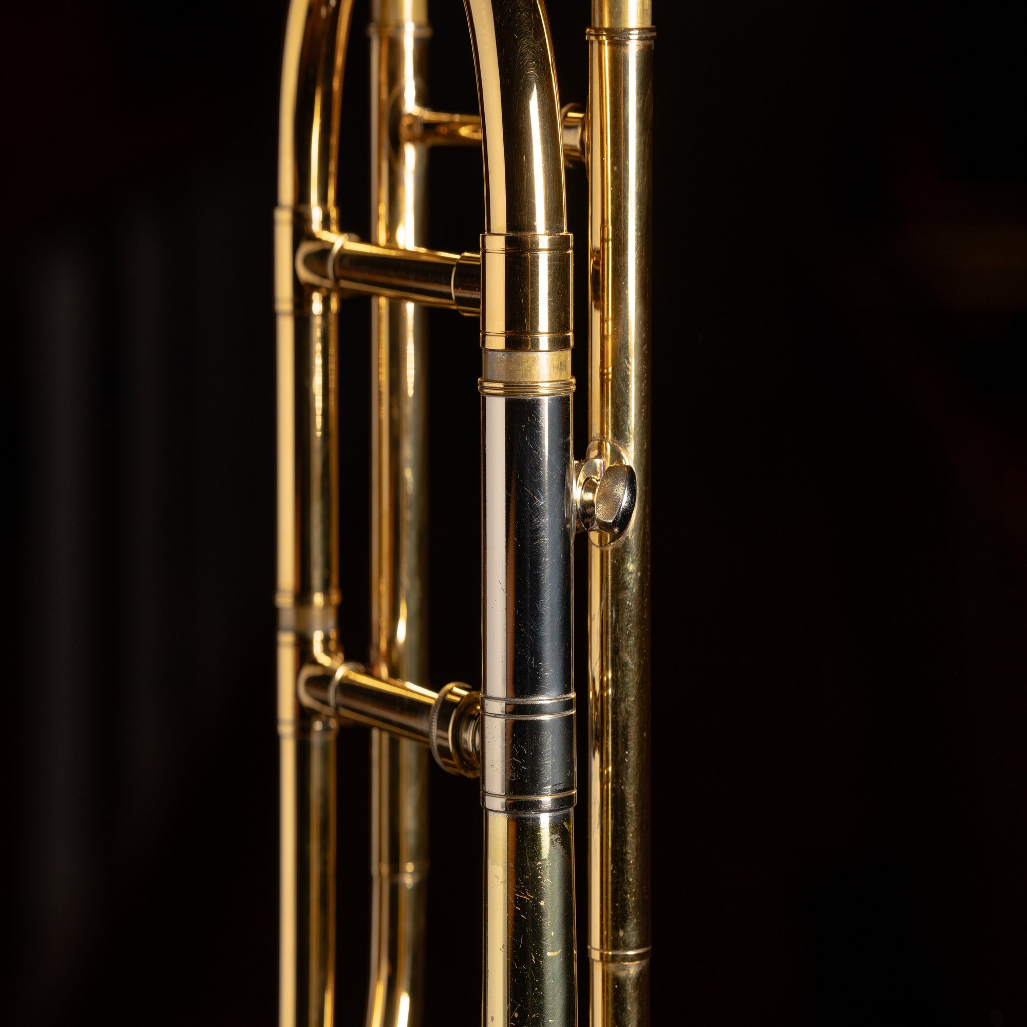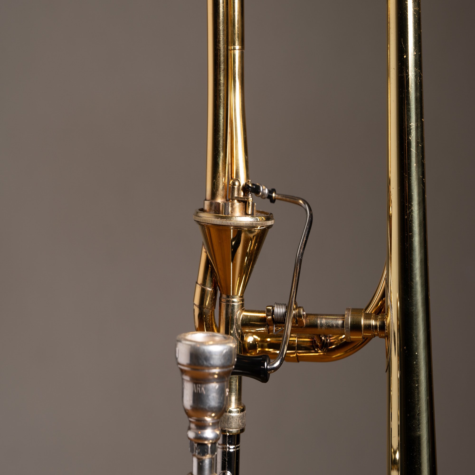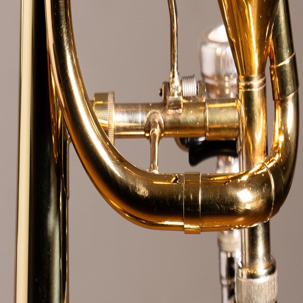 前後に分かれている主管とF管がネジで留められているのは古いモデルにあるタイプらしく、各パイプをしっかりと固定しています。その結果楽器の剛性感がアップし、それに伴いしっかりした抵抗感(吹奏感)が得られるのが特徴です。その独特な吹奏感を好むトロンボーン奏者が近年ジワリと増えているそうです。古いものから改良されているモデルでは2本の管が支柱パイプにより固定されているそうで、そちらの方のナチュラルな吹奏感は現代での主流のようです。山口の楽器も支柱タイプへとコンバートしたこともあるそうですが、「やはりネジ式だな」と考え、ネジを付け直したそうです、