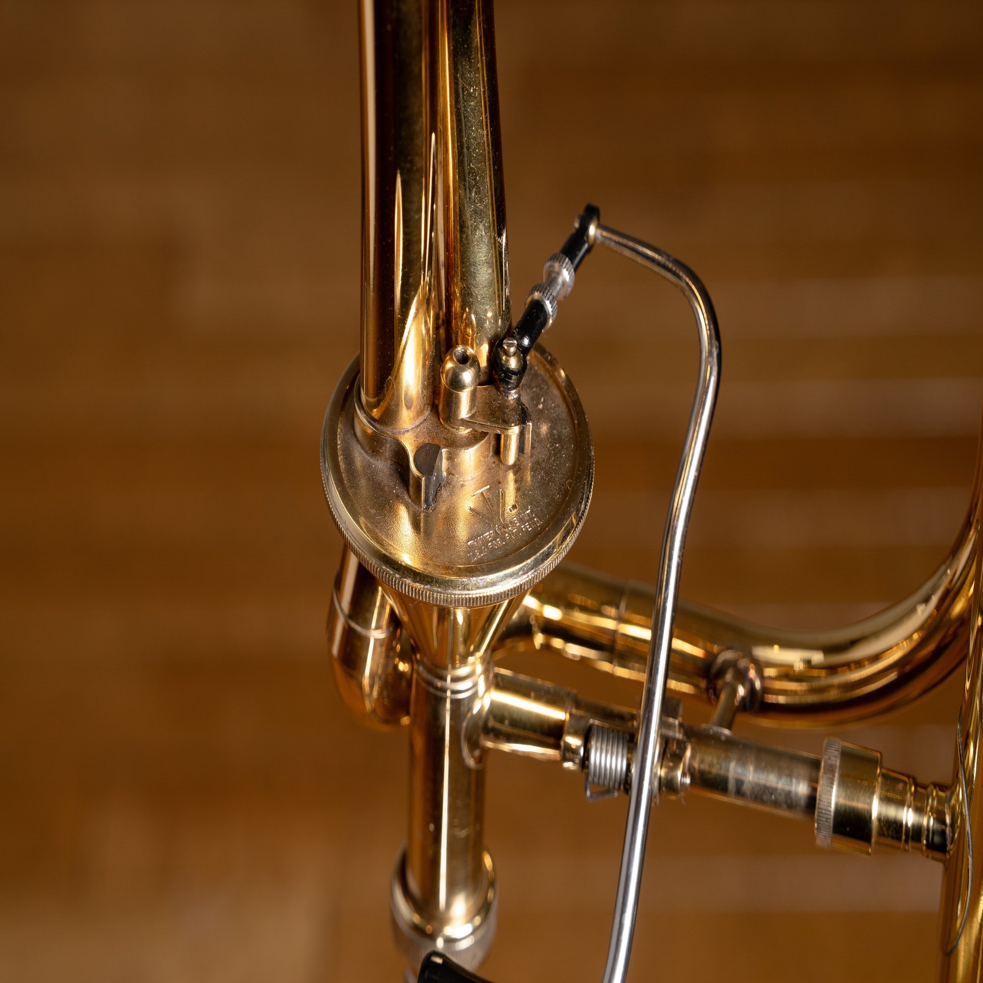 上述のアキシャルフローバルブを操作するレバーを受け止めるための四角い小さなパーツが支柱部分に付いているのが見えます。このパーツが付いている楽器、実は世界に5本程度しかないそうなのです。しかもその5本はエドワーズのトロンボーン制作の歴史の最初期ロットの5本なのです。