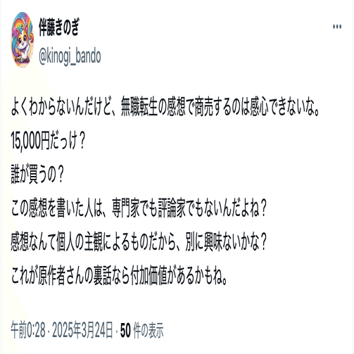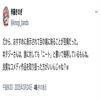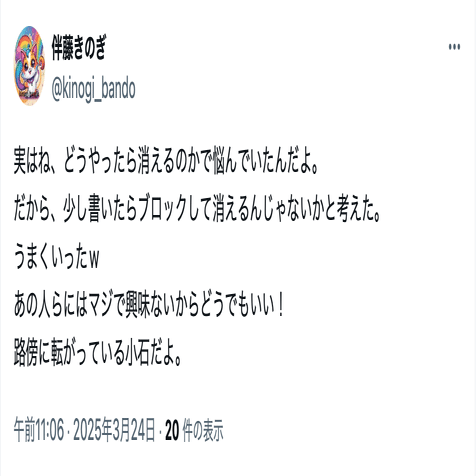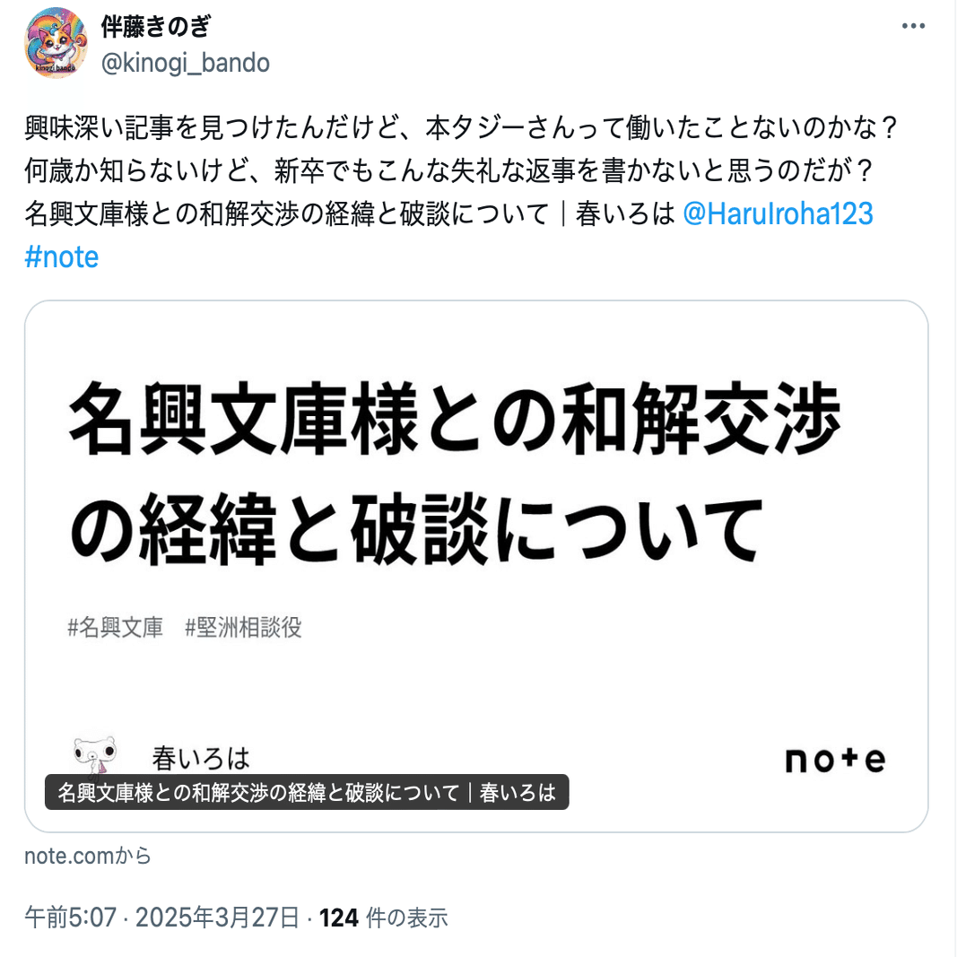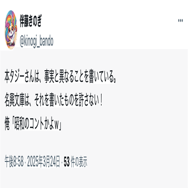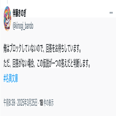 伴藤きのぎ(@kinogi_bando)は、名興文庫が開示したアカウントとコンタクトは取っていなかったが、投稿には名興文庫を嘲笑するものがあったことから、問題視していた。