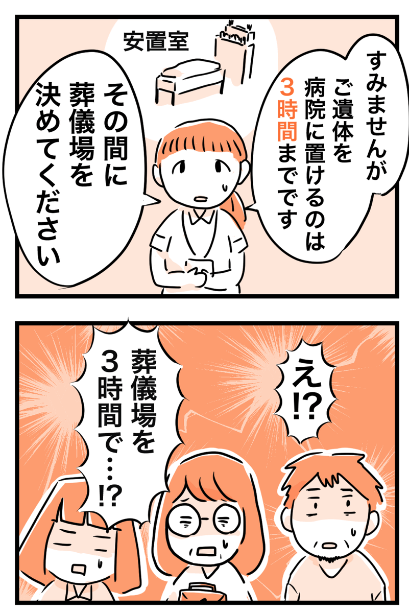 初手の三時間で葬儀場を決めてくださいが事実じゃなくてで、葬儀社を決めてくださいなんだよな。漫画は誇張入るからなあ。