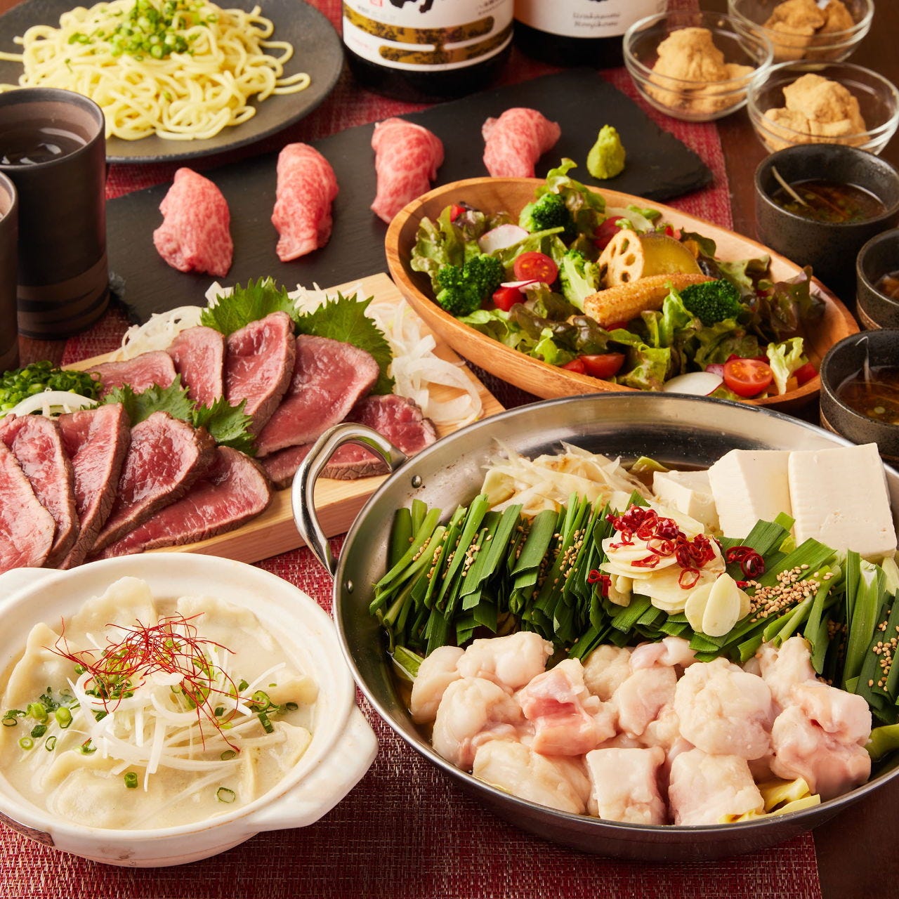 名物もつ鍋をはじめ、博多の名物を多数ご用意しております!もつ鍋は新鮮なお野菜をふんだんに使用した、ヘルシーなのに、コラーゲンたっぷりのお鍋です。〆のちゃんぽん麺との相性も抜群!★基本プランに+1100円(税込)でプレミアムメニューも食べ放題でお楽しみ頂けます!もちろん、それ以上のお代は頂きません♪