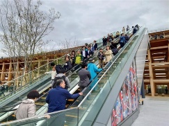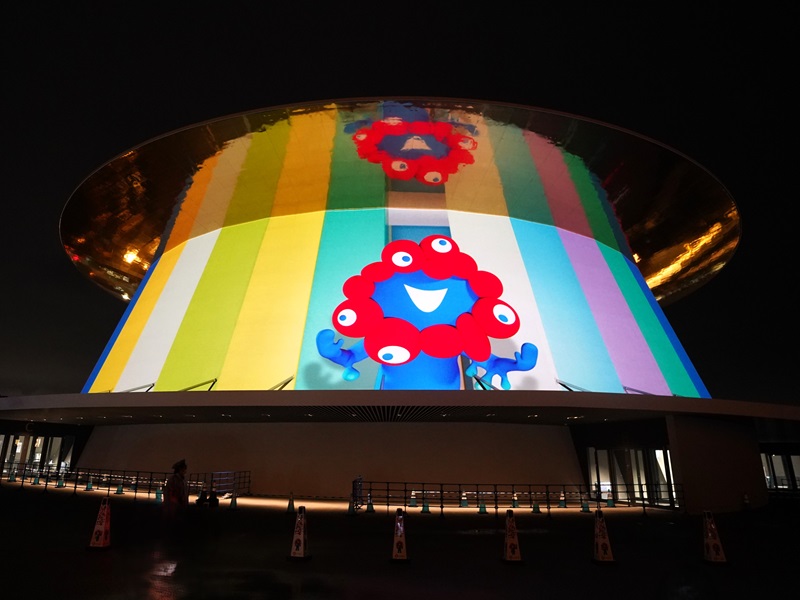 日が傾いた午後5時ごろ、この展示物で屋外用投光器の電源が入った。ライトアップされた展示物は目立ち、さらに人が集まった。