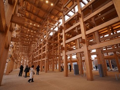 展示物はスギの角材で立方体の骨組み(キューブ)を数多くつくり、積み上げて固定し、ジャングルジム状に仕立てたものだ。意匠として、キューブ内や地面に多量のかんなくずを使用していた〔図1〕。