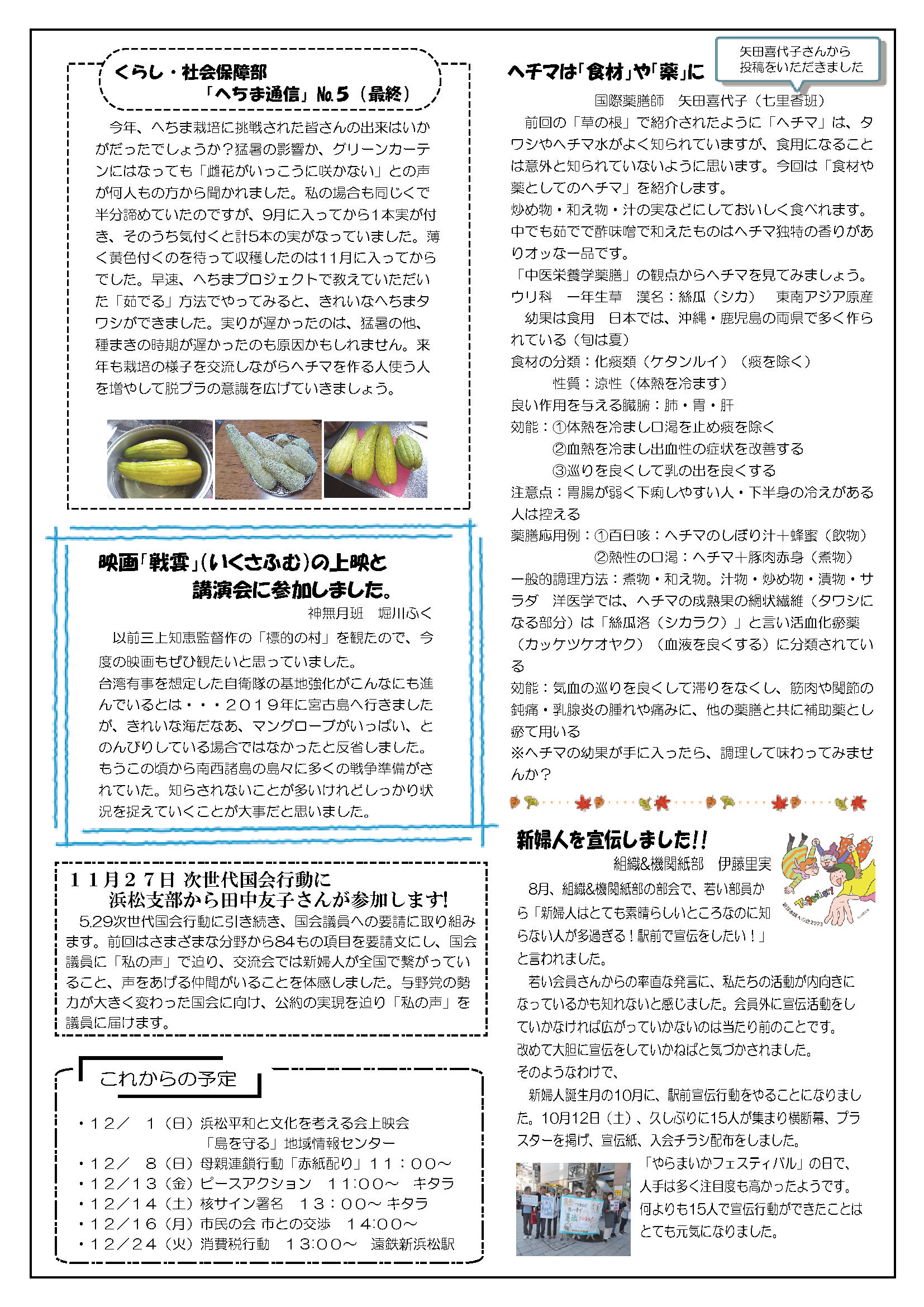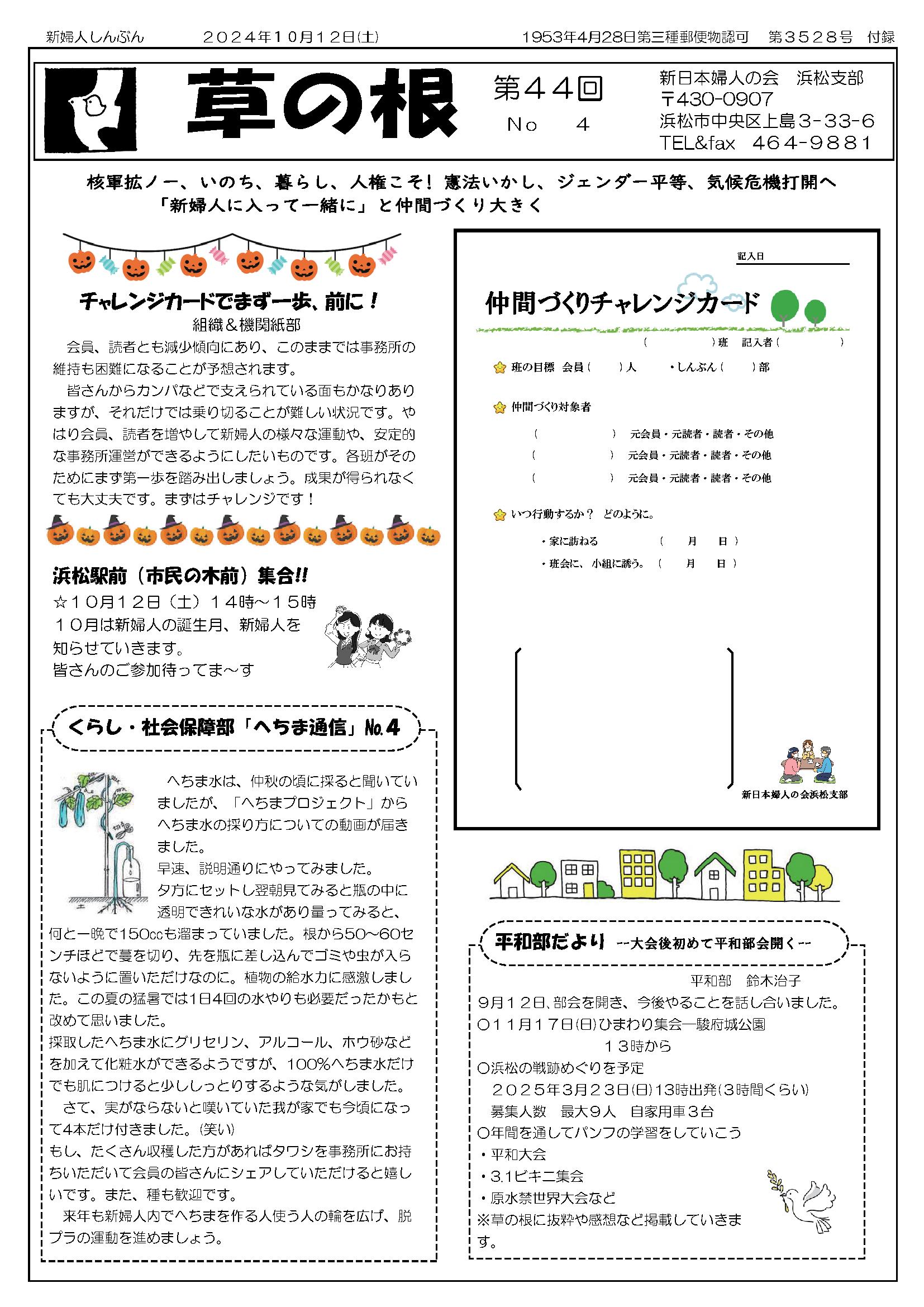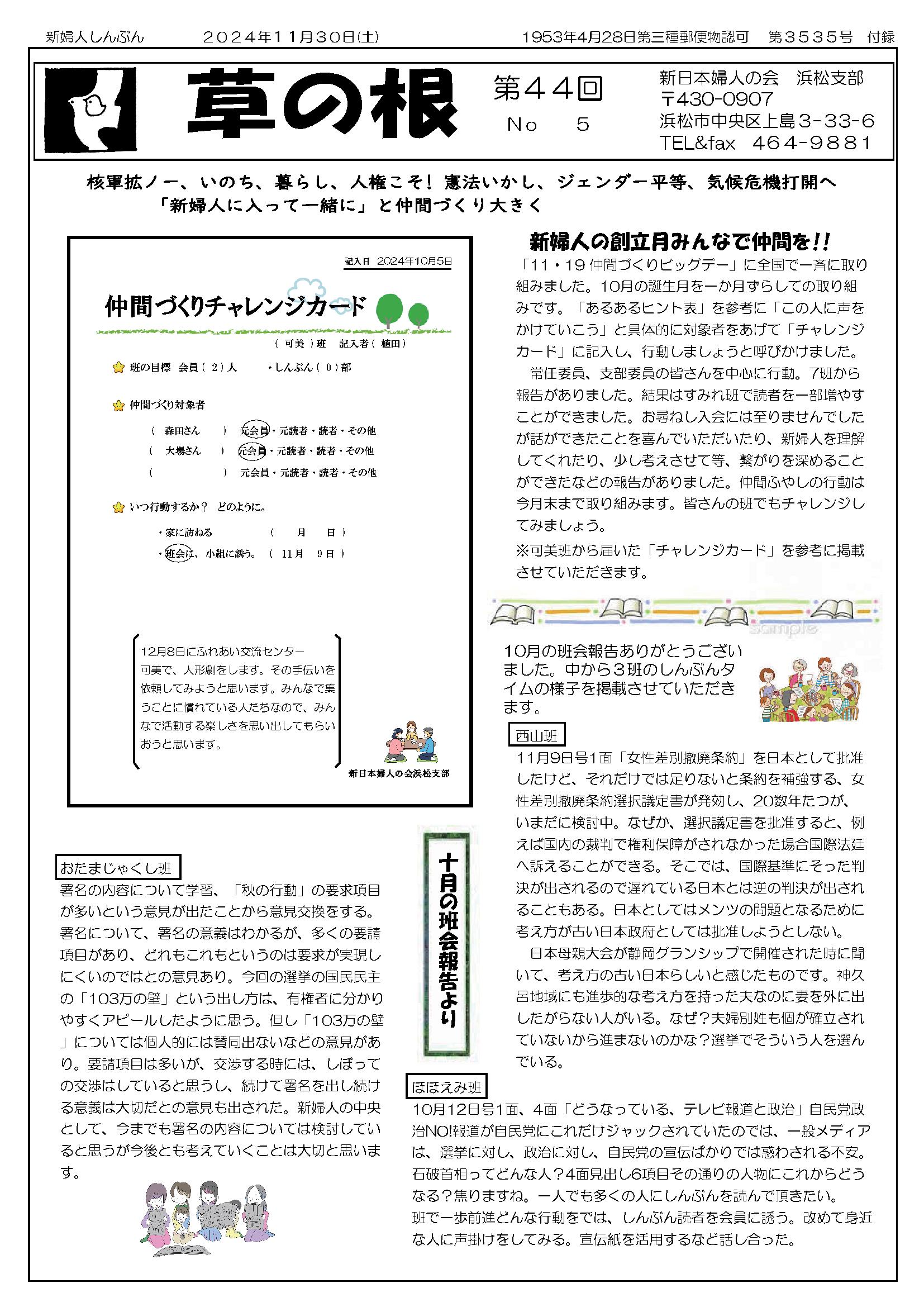 11月30日(土) 草の根 第44回 No05発行 仲間つくりチャレンジカード へちま通信 新日本婦人の会浜松支部機関紙