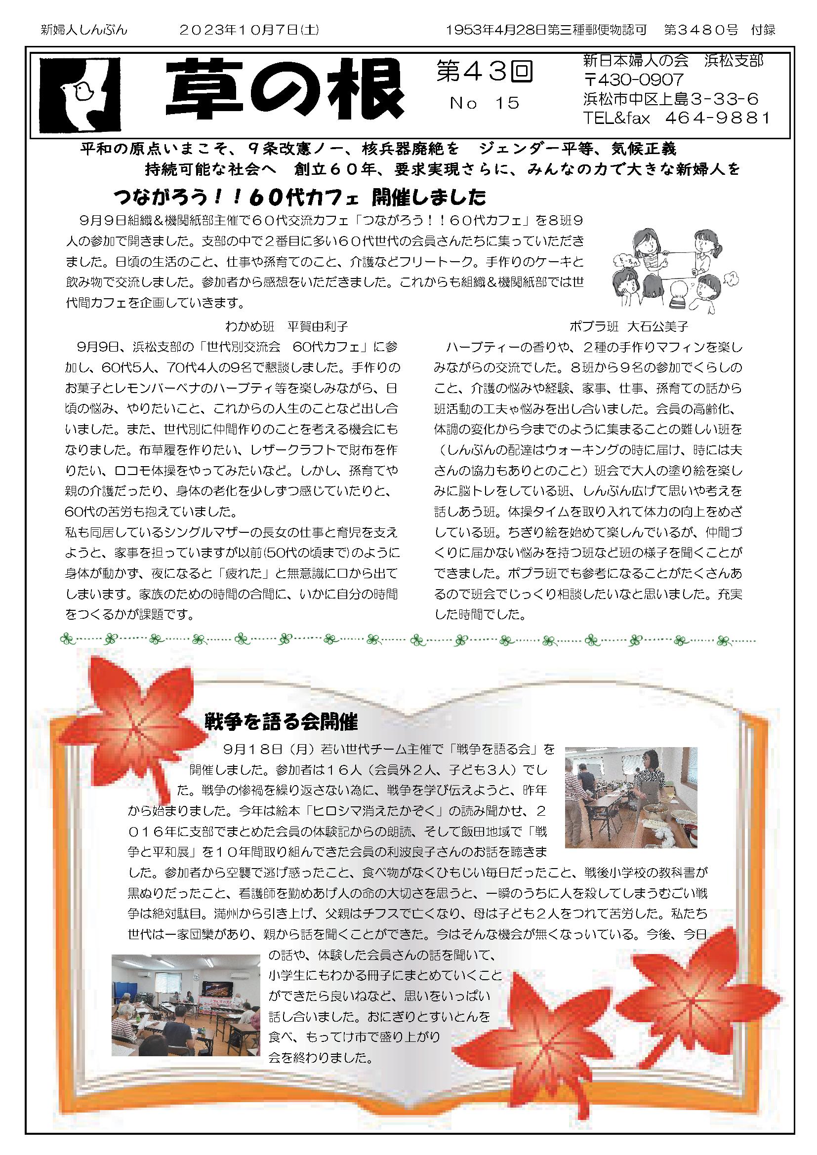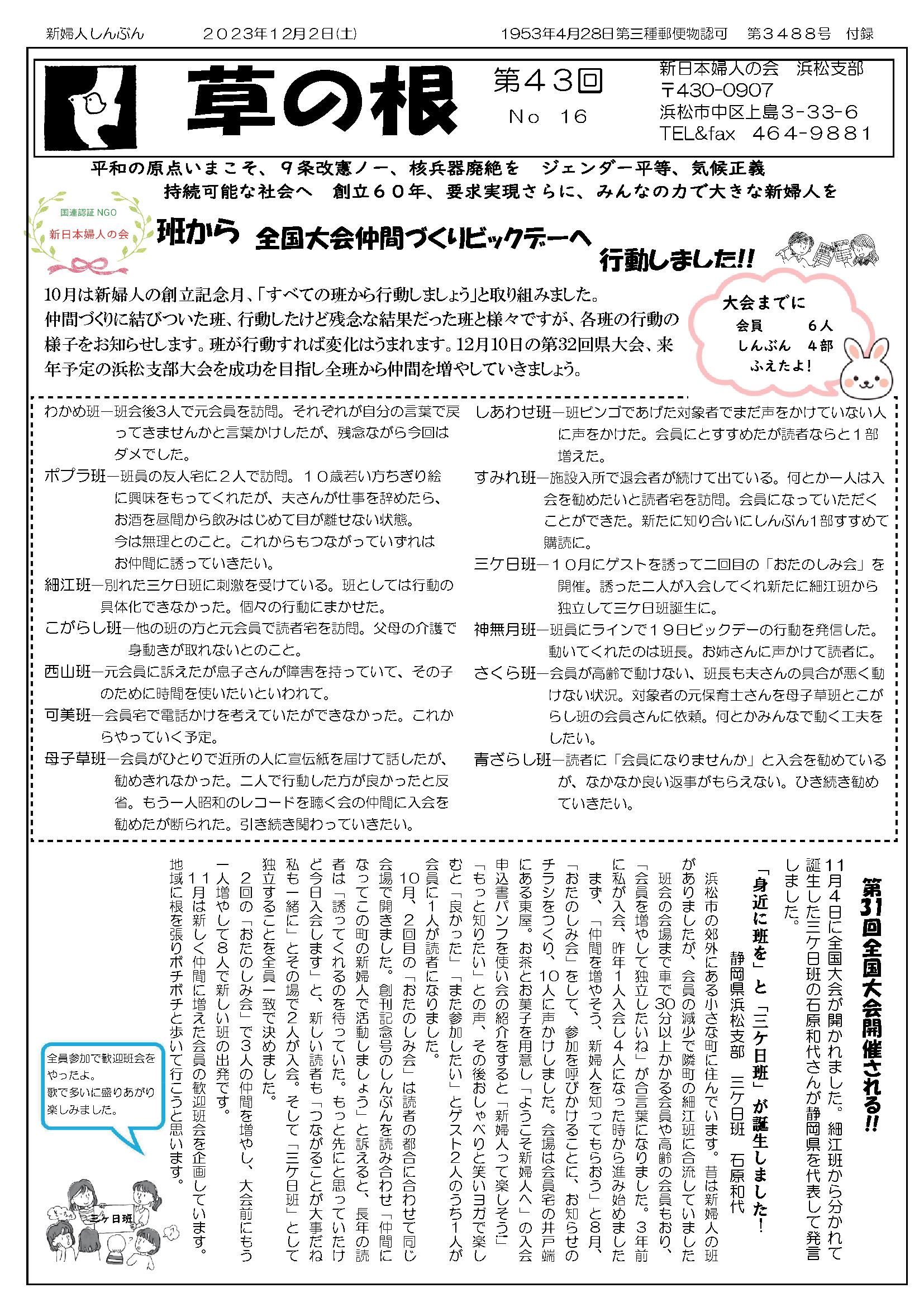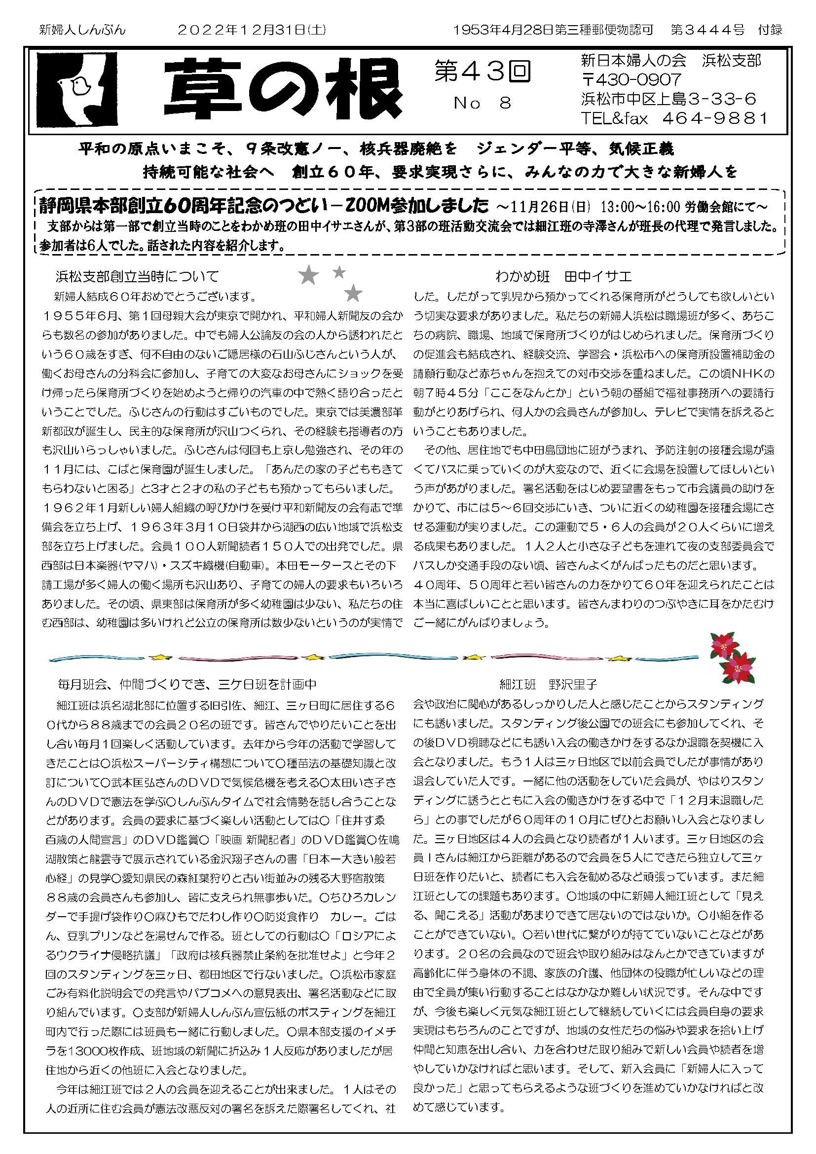 11月30日(土) 草の根 第44回 No05発行 仲間つくりチャレンジカード へちま通信 新日本婦人の会浜松支部機関紙
