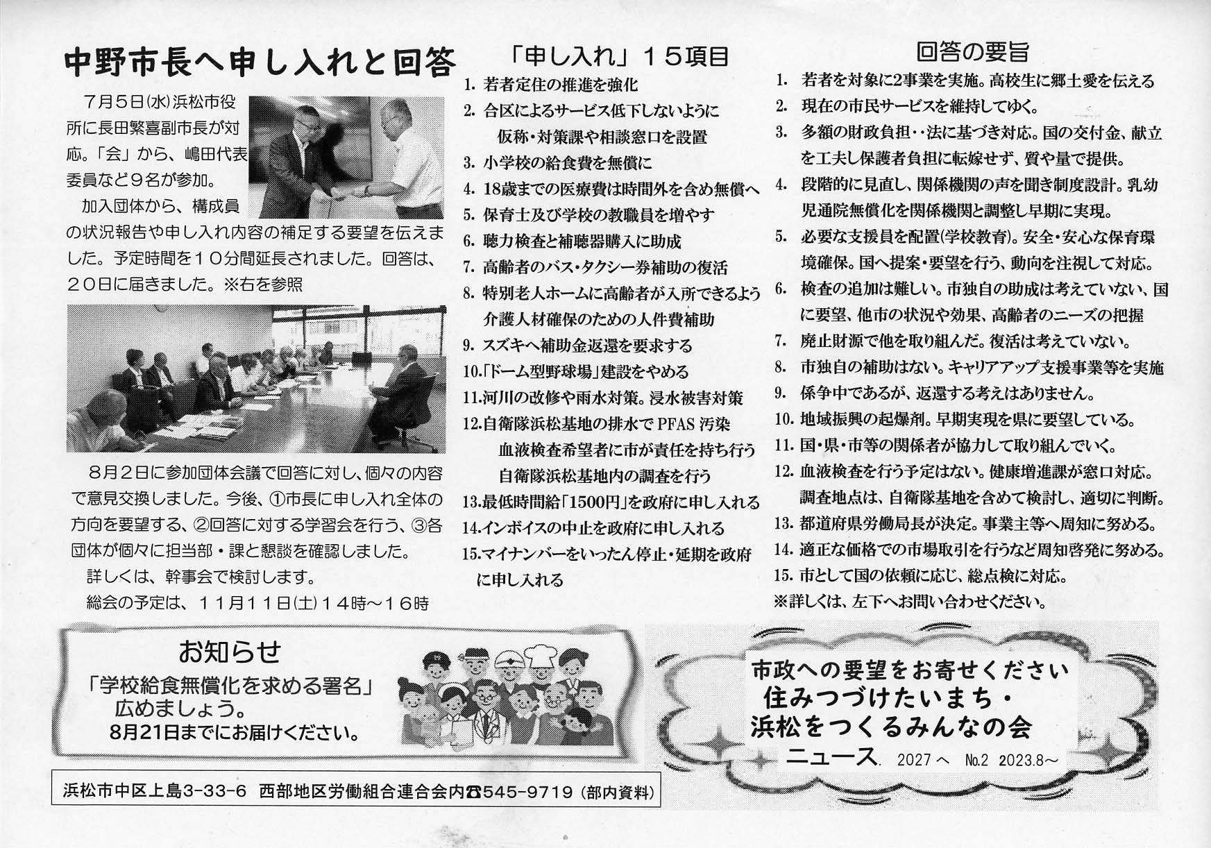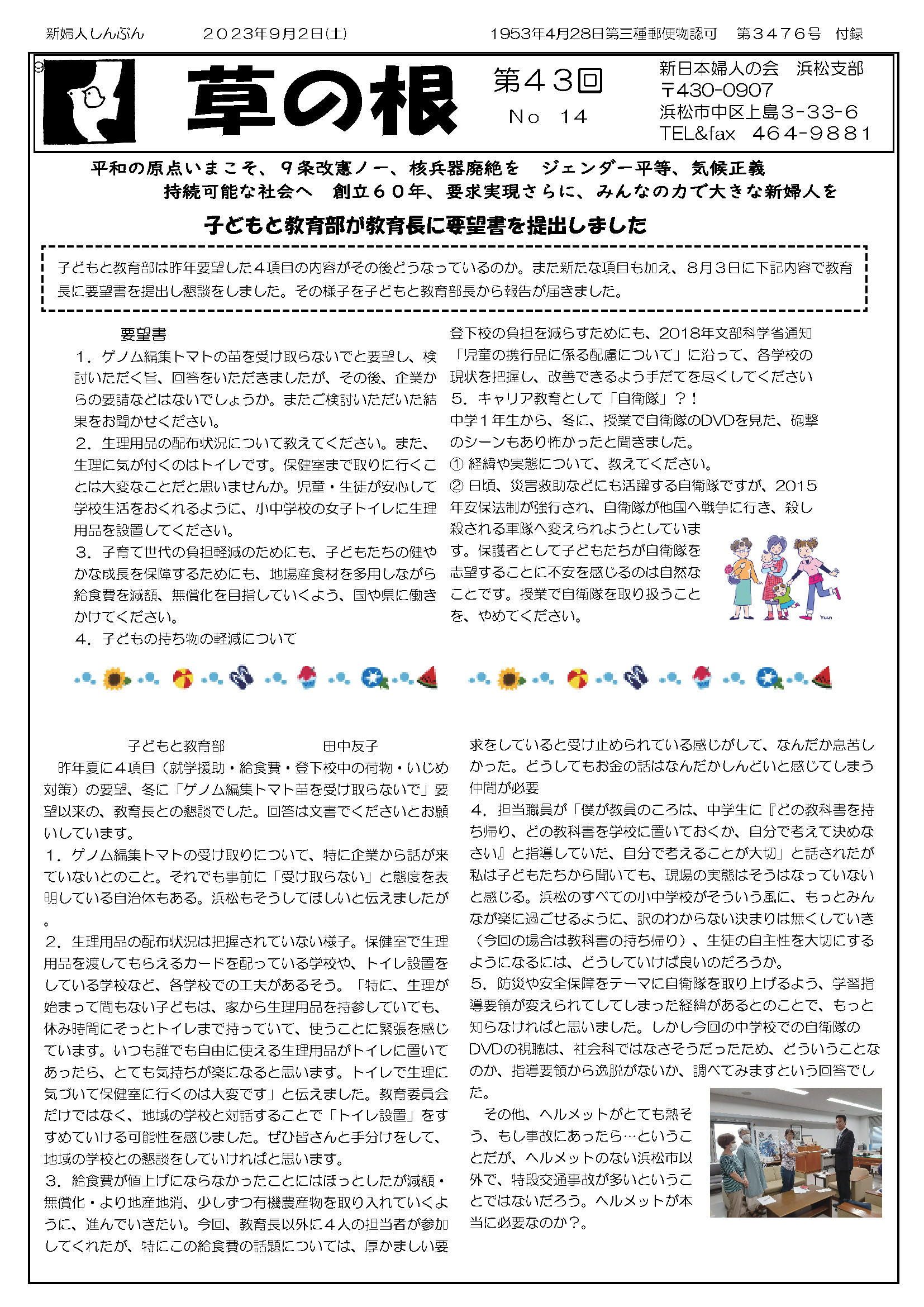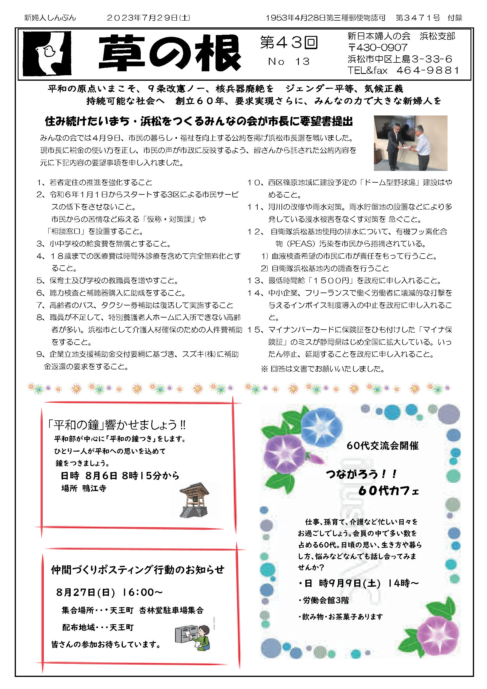07月29日(土) 草の根 No13発行 市長に要望書提出 友じいちゃんの歴史散歩 新日本婦人の会浜松支部機関紙
