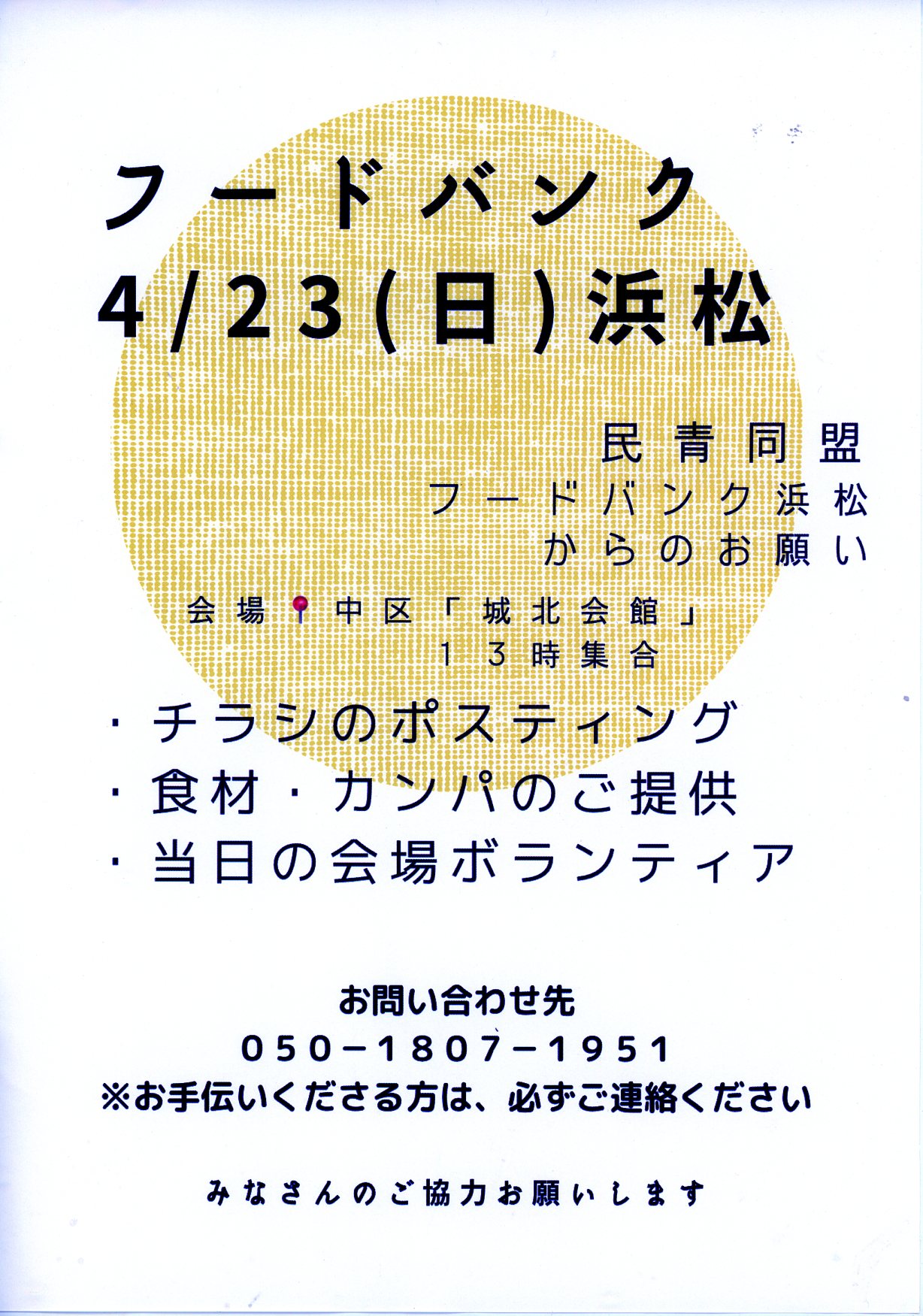 4月23日(日)13:00 城北会館 食材・カンパのご提供・ボランティア