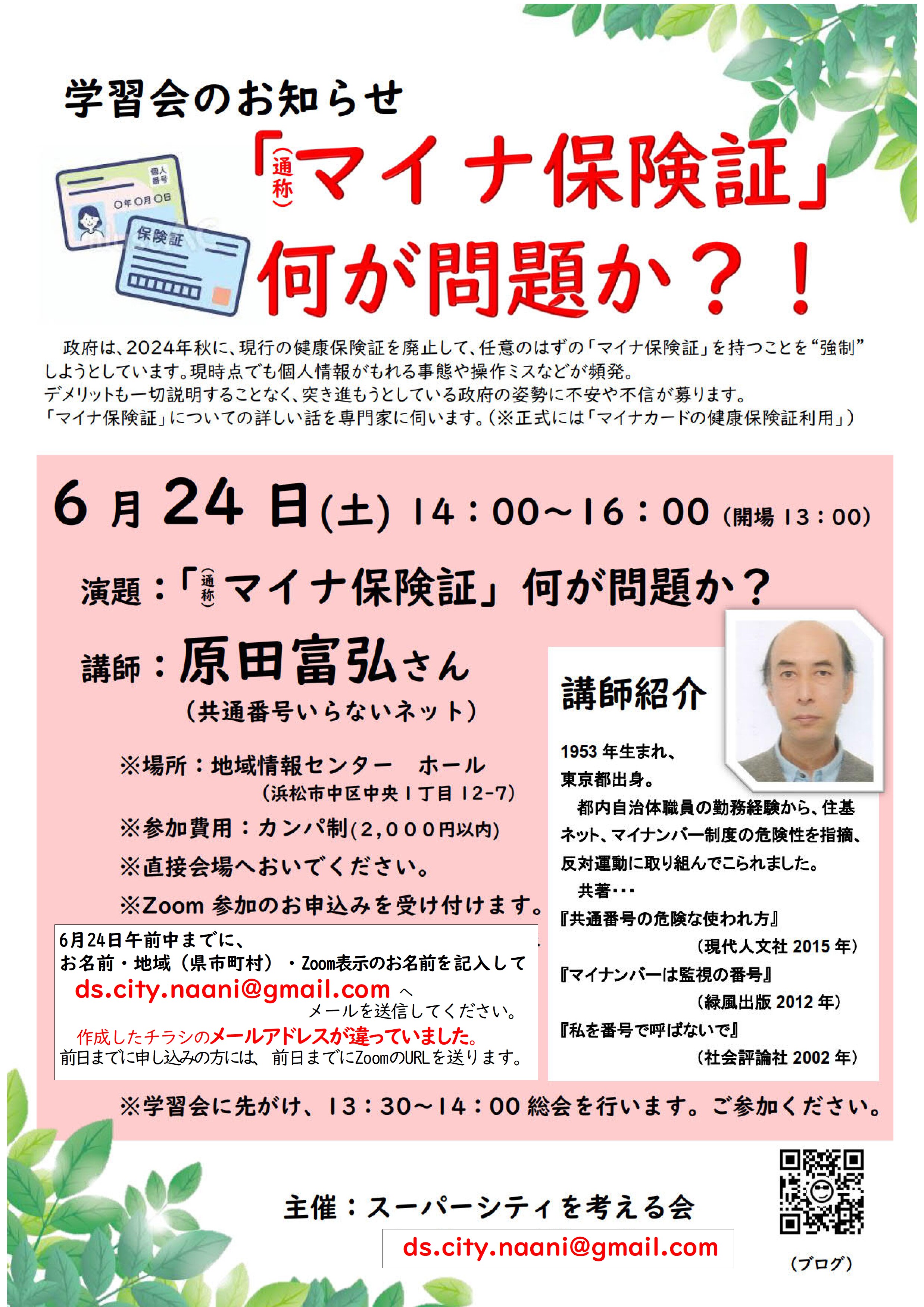 6月24日(土)14:00 学習会のお知らせ『マイナ保険証』何が問題か?